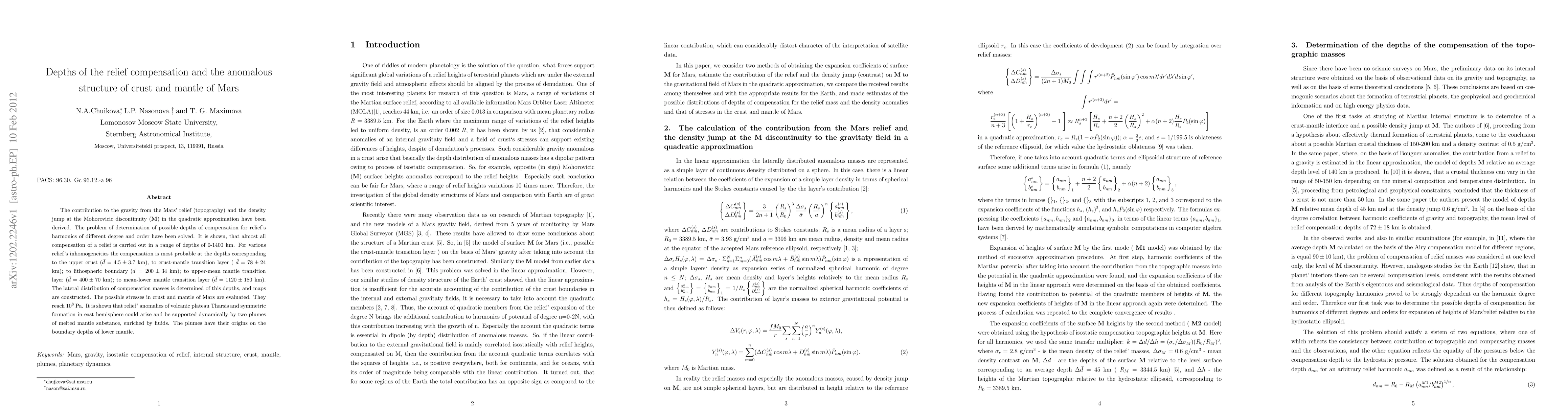 This study determined the contribution of Martian topography and the density jump at the Mohorovicic discontinuity (M) to the gravity in a quadratic approximation. It also resolved the problem of determining the possible depths of compensation for topography harmonics of various degrees and orders. It shows that all the topography compensation is within the depth range from 0 to 1400 km. Different topographic irregularities are most likely to be compensated at depths that correspond to the upper crust (d =(4.5 +- 3.7)km), crust-mantle transition layer (d = (78 +- 24)km), lithospheric boundary (d = (200 +- 34)km), upper-middle mantle transition layer (d = (400 +- 70)km), or middle-lower mantle transition layer (d =(1120 +- 180)km). This paper presents the lateral distributions of compensation masses for these depths and the respective maps. According to calculations, stresses in the Martian crust and mantle may be as high as 10^8 Pa. This paper shows that the topographic anomalies of the Tharsis volcanic plateau and the symmetric formation in the eastern hemisphere could have originated and be dynamically maintained by two plumes of melted mantle substance enriched with fluids; these plumes may have their origin at the boundary of the lower mantle.