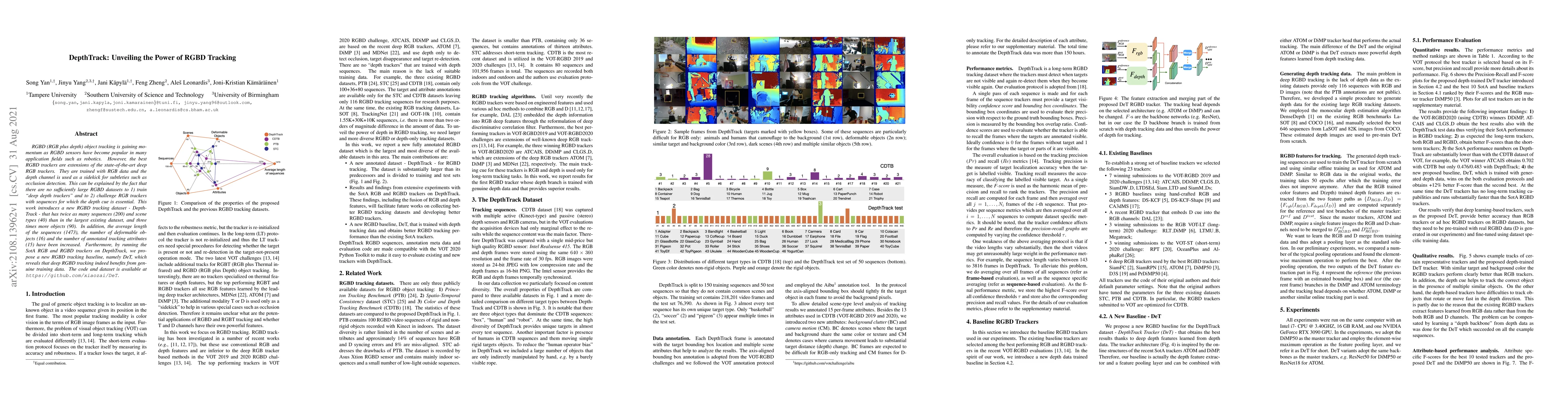 DepthTrack introduces a new RGBD tracking dataset with extensive sequences, scene types, and objects, aiming to challenge existing RGB trackers. The study proposes a new RGBD tracking baseline, DeT, demonstrating that deep RGBD tracking benefits significantly from dedicated training data.