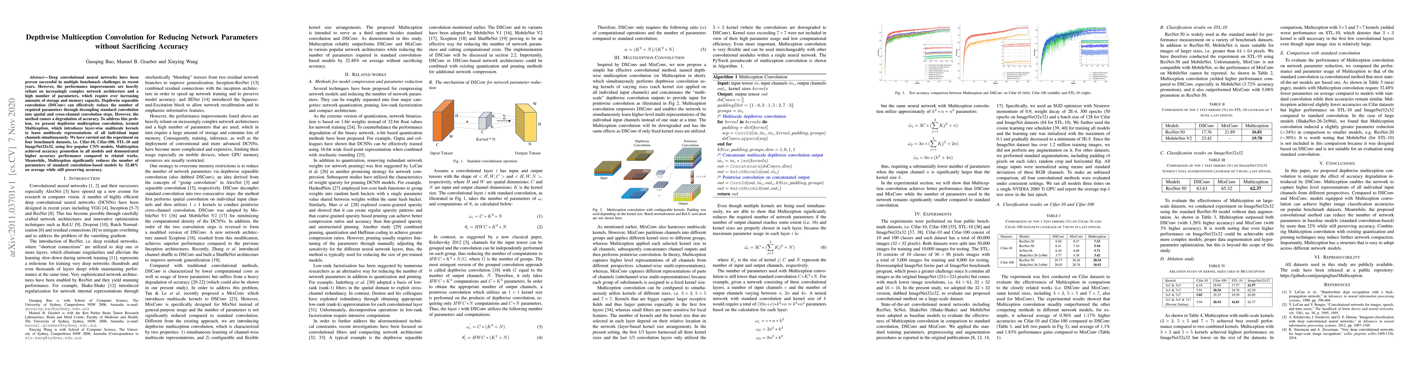 Deep convolutional neural networks have been proven successful in multiple benchmark challenges in recent years. However, the performance improvements are heavily reliant on increasingly complex network architecture and a high number of parameters, which require ever increasing amounts of storage and memory capacity. Depthwise separable convolution (DSConv) can effectively reduce the number of required parameters through decoupling standard convolution into spatial and cross-channel convolution steps. However, the method causes a degradation of accuracy. To address this problem, we present depthwise multiception convolution, termed Multiception, which introduces layer-wise multiscale kernels to learn multiscale representations of all individual input channels simultaneously. We have carried out the experiment on four benchmark datasets, i.e. Cifar-10, Cifar-100, STL-10 and ImageNet32x32, using five popular CNN models, Multiception achieved accuracy promotion in all models and demonstrated higher accuracy performance compared to related works. Meanwhile, Multiception significantly reduces the number of parameters of standard convolution-based models by 32.48% on average while still preserving accuracy.