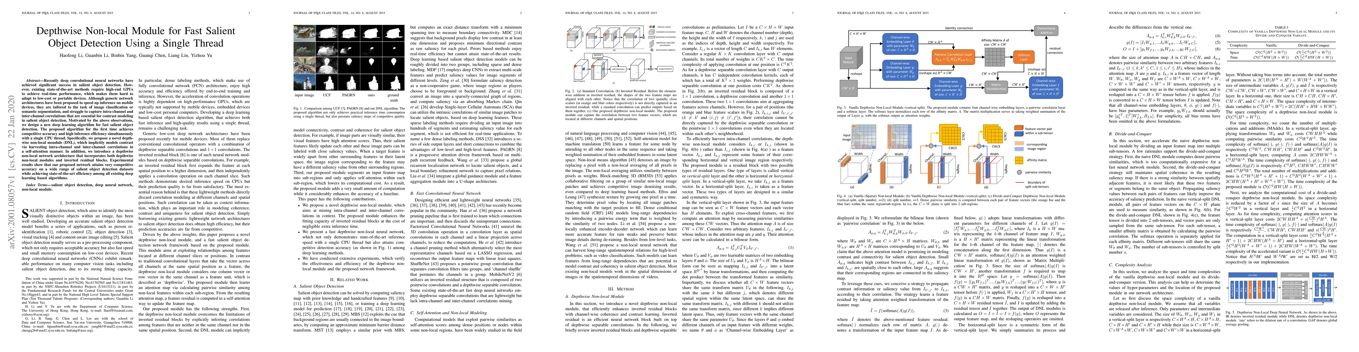 This paper proposes a novel depthwise non-local module (DNL) and a corresponding network architecture to achieve fast and accurate salient object detection using a single CPU thread. The DNL module captures intra-channel and inter-channel correlations for effective contrast modeling, leading to competitive accuracy and state-of-the-art efficiency.