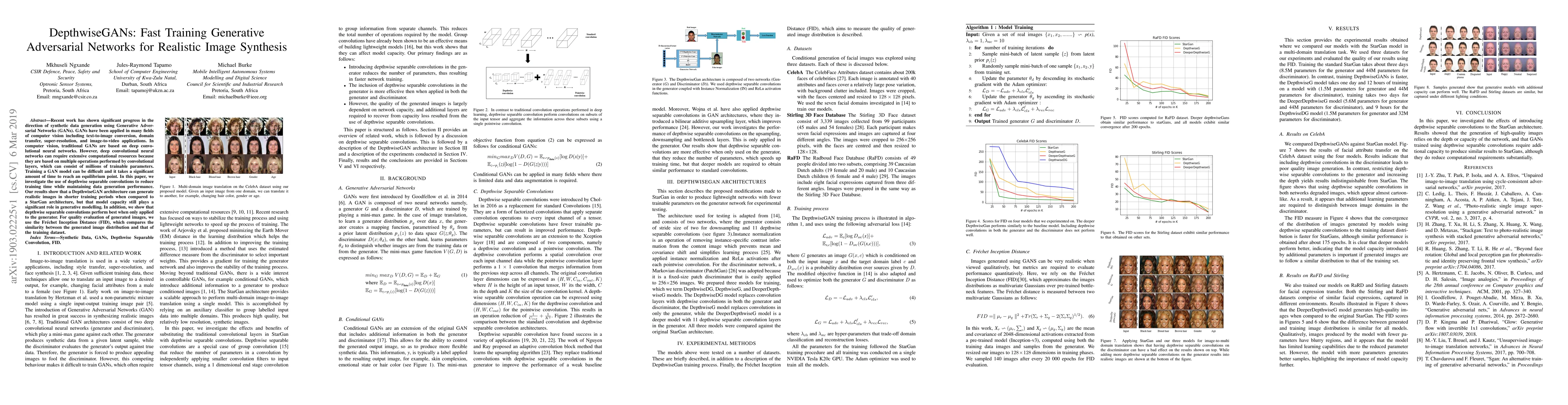 Recent work has shown significant progress in the direction of synthetic data generation using Generative Adversarial Networks (GANs). GANs have been applied in many fields of computer vision including text-to-image conversion, domain transfer, super-resolution, and image-to-video applications. In computer vision, traditional GANs are based on deep convolutional neural networks. However, deep convolutional neural networks can require extensive computational resources because they are based on multiple operations performed by convolutional layers, which can consist of millions of trainable parameters. Training a GAN model can be difficult and it takes a significant amount of time to reach an equilibrium point. In this paper, we investigate the use of depthwise separable convolutions to reduce training time while maintaining data generation performance. Our results show that a DepthwiseGAN architecture can generate realistic images in shorter training periods when compared to a StarGan architecture, but that model capacity still plays a significant role in generative modelling. In addition, we show that depthwise separable convolutions perform best when only applied to the generator. For quality evaluation of generated images, we use the Fr\'echet Inception Distance (FID), which compares the similarity between the generated image distribution and that of the training dataset.