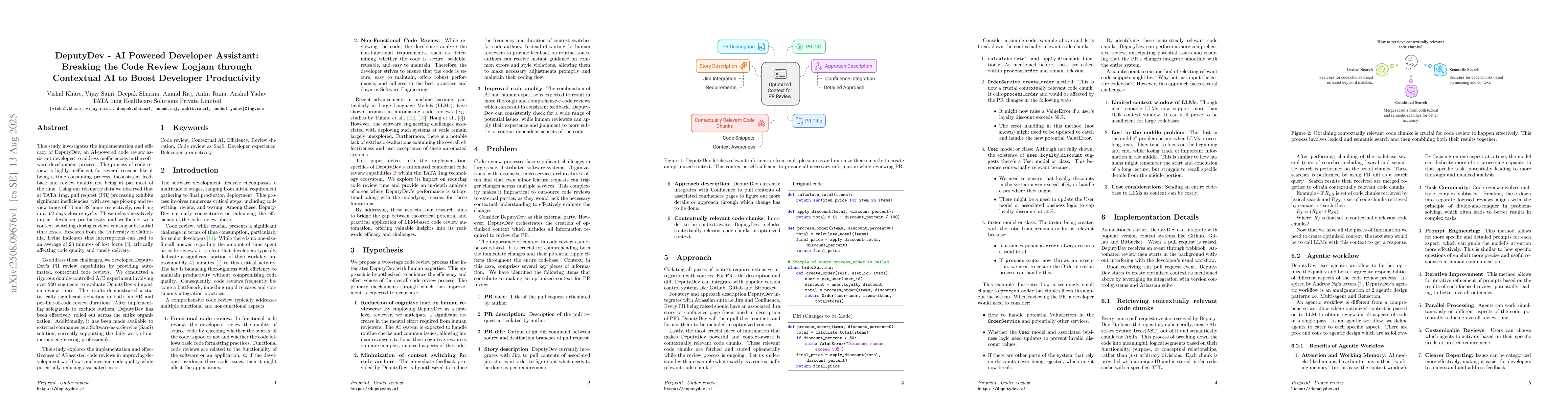 This study investigates the implementation and efficacy of DeputyDev, an AI-powered code review assistant developed to address inefficiencies in the software development process. The process of code review is highly inefficient for several reasons, such as it being a time-consuming process, inconsistent feedback, and review quality not being at par most of the time. Using our telemetry data, we observed that at TATA 1mg, pull request (PR) processing exhibits significant inefficiencies, with average pick-up and review times of 73 and 82 hours, respectively, resulting in a 6.2 day closure cycle. The review cycle was marked by prolonged iterative communication between the reviewing and submitting parties. Research from the University of California, Irvine indicates that interruptions can lead to an average of 23 minutes of lost focus, critically affecting code quality and timely delivery. To address these challenges, we developed DeputyDev's PR review capabilities by providing automated, contextual code reviews. We conducted a rigorous double-controlled A/B experiment involving over 200 engineers to evaluate DeputyDev's impact on review times. The results demonstrated a statistically significant reduction in both average per PR (23.09%) and average per-line-of-code (40.13%) review durations. After implementing safeguards to exclude outliers, DeputyDev has been effectively rolled out across the entire organisation. Additionally, it has been made available to external companies as a Software-as-a-Service (SaaS) solution, currently supporting the daily work of numerous engineering professionals. This study explores the implementation and effectiveness of AI-assisted code reviews in improving development workflow timelines and code.