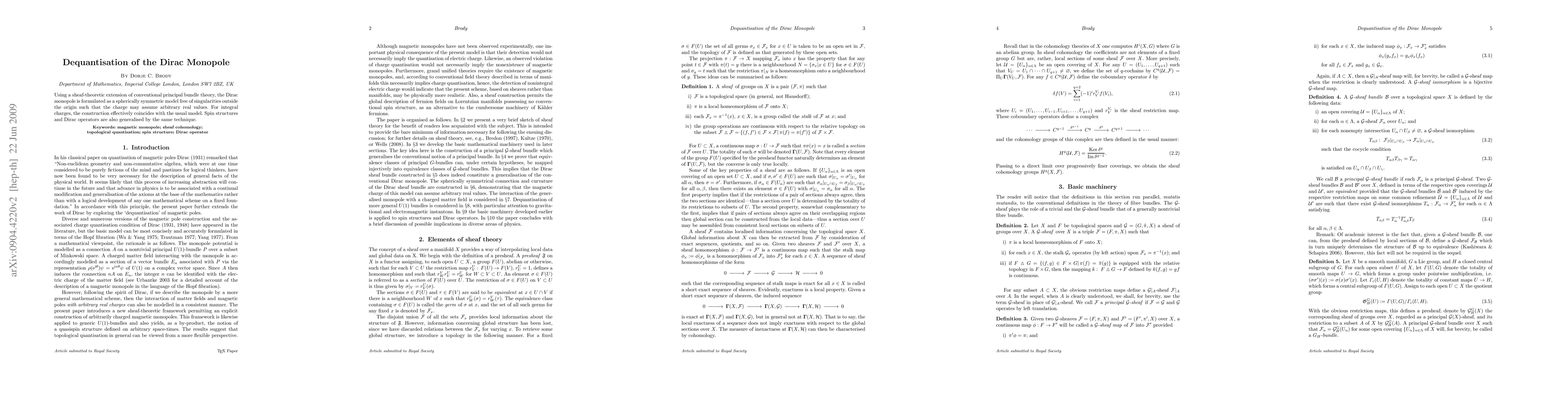 Researchers developed a new model for the Dirac monopole without singularities, allowing charges to take on arbitrary real values. This achievement generalizes spin structures and Dirac operators using sheaf-theoretic methods.