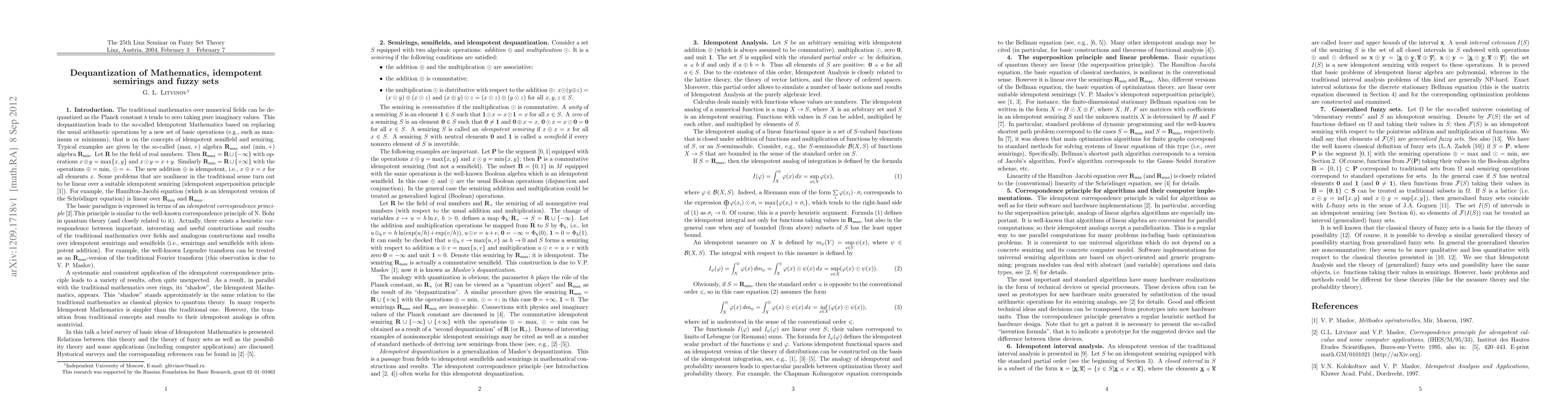 This paper surveys idempotent mathematics, exploring its connections to fuzzy sets and possibility theory, and discusses its applications, particularly in computer science. The focus is on how dequantization in mathematics can be applied to these theories.