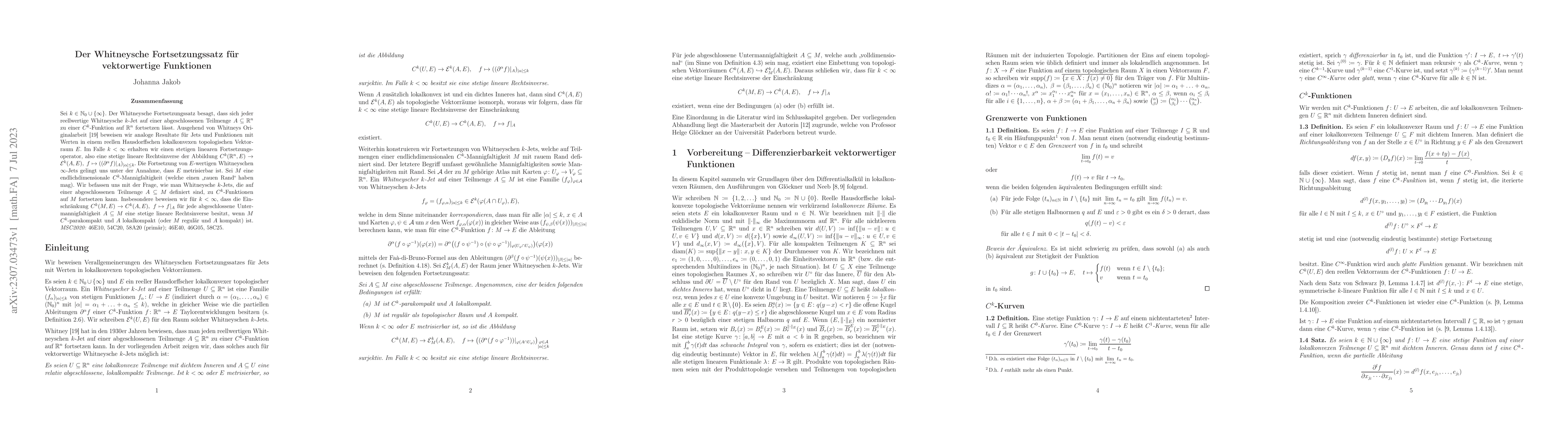 Let $k\in\mathbb{N}_0\cup\{\infty\}$. According to Whitney's extension theorem, each real-valued Whitney $k$-Jet on a closed subset $A\subseteq\mathbb{R}^n$ can be extended to a $C^k$-function on $\mathbb{R}^n$. Based on Whitney's original work, we prove analogous results for jets and functions with values in a real Hausdorff locally convex topological vector space $E$. In the case $k<\infty$, we obtain a continious linear extension operator, that is a continious linear right inverse of the map $C^k(\mathbb{R}^n,E)\to \mathcal{E}^k(A,E),\ f\mapsto ((\partial^{\alpha} f)\vert_A)_{\vert\alpha\vert\leq k}.$ Assuming that $E$ ist metrizable, we also succeed in extending Whitney $\infty$-jets. Given a $C^k$-manifold $M$ (which may have a "rough boundary"), we deal with the problem how to extend Whitney $k$-Jets defined on closed subsets $A\subseteq M$ to $C^k$-functions on $M$. In particular, we show for $k<\infty$ that the restriction map $C^k(M,E)\to C^k(A,E),\ f\mapsto f\vert_A$ has a continuous linear right inverse for each closed submanifold $A\subseteq M$ if $M$ is $C^k$-paracompact and $A$ locally compact, or if $M$ is regular and $A$ compact. ----- Sei $k\in\mathbb{N}_0\cup\{\infty\}$. Der Whitneysche Fortsetzungssatz besagt, dass sich jeder reellwertige Whitneysche $k$-Jet auf einer abgeschlossenen Teilmenge $A\subseteq\mathbb{R}^n$ zu einer $C^k$-Funktion auf $\mathbb{R}^n$ fortsetzen l\"asst. Ausgehend von Whitneys Originalarbeit beweisen wir analoge Resultate f\"ur Jets und Funktionen mit Werten in einem reellen Hausdorffschen lokalkonvexen topologischen Vektorraum $E$. Im Falle $k<\infty$ erhalten wir einen stetigen linearen Fortsetzungsoperator, also eine stetige lineare Rechtsinverse der Abbildung $C^k(\mathbb{R}^n,E)\to \mathcal{E}^k(A,E),\ f\mapsto ((\partial^{\alpha} f)\vert_A)_{\vert\alpha\vert\leq k}.$ Die Fortsetzung von $E$-wertigen Whitneyschen $\infty$-Jets gelingt uns unter der Annahme, dass $E$ metrisierbar ist. Sei $M$ eine endlichdimensionale $C^k$-Mannigfaltigkeit (welche einen "rauen Rand" haben mag). Wir befassen uns mit der Frage, wie man Whitneysche $k$-Jets, die auf einer abgeschlossenen Teilmenge $A\subseteq M$ definiert sind, zu $C^k$-Funktionen auf $M$ fortsetzen kann. Insbesondere beweisen wir f\"ur $k<\infty$ dass die Einschr\"ankung $C^k(M,E)\to C^k(A,E),\ f\mapsto f\vert_A$ f\"ur jede abgeschlossene Untermannigfaltigkeit $A\subseteq M$ eine stetige lineare Rechtsinverse besitzt, wenn $M$ $C^k$-parakompakt und $A$ lokalkompakt, oder $M$ regul\"ar und $A$ kompakt ist.