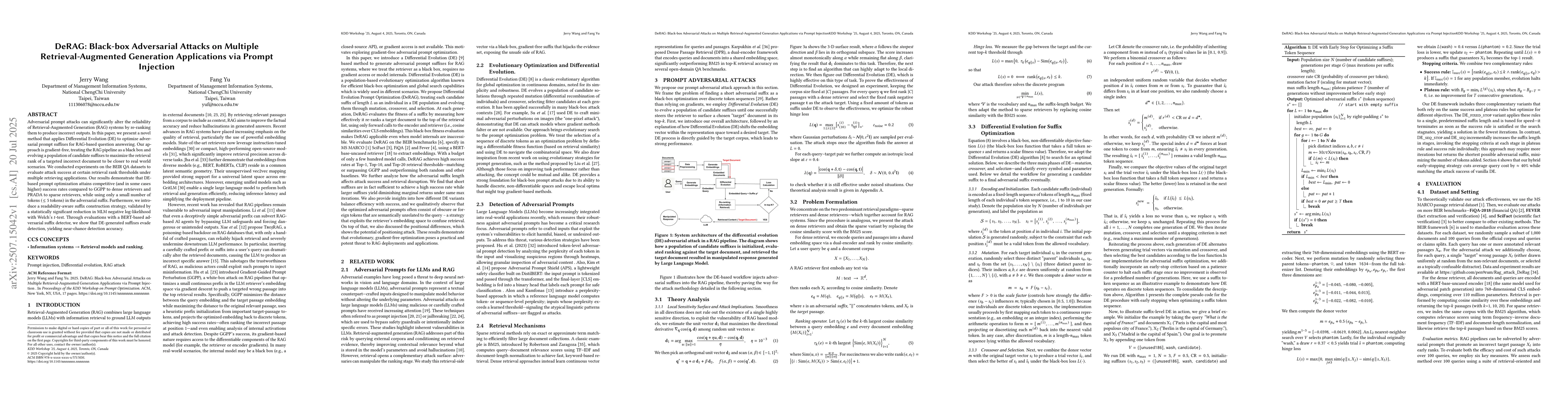 Adversarial prompt attacks can significantly alter the reliability of Retrieval-Augmented Generation (RAG) systems by re-ranking them to produce incorrect outputs. In this paper, we present a novel method that applies Differential Evolution (DE) to optimize adversarial prompt suffixes for RAG-based question answering. Our approach is gradient-free, treating the RAG pipeline as a black box and evolving a population of candidate suffixes to maximize the retrieval rank of a targeted incorrect document to be closer to real world scenarios. We conducted experiments on the BEIR QA datasets to evaluate attack success at certain retrieval rank thresholds under multiple retrieving applications. Our results demonstrate that DE-based prompt optimization attains competitive (and in some cases higher) success rates compared to GGPP to dense retrievers and PRADA to sparse retrievers, while using only a small number of tokens (<=5 tokens) in the adversarial suffix. Furthermore, we introduce a readability-aware suffix construction strategy, validated by a statistically significant reduction in MLM negative log-likelihood with Welch's t-test. Through evaluations with a BERT-based adversarial suffix detector, we show that DE-generated suffixes evade detection, yielding near-chance detection accuracy.