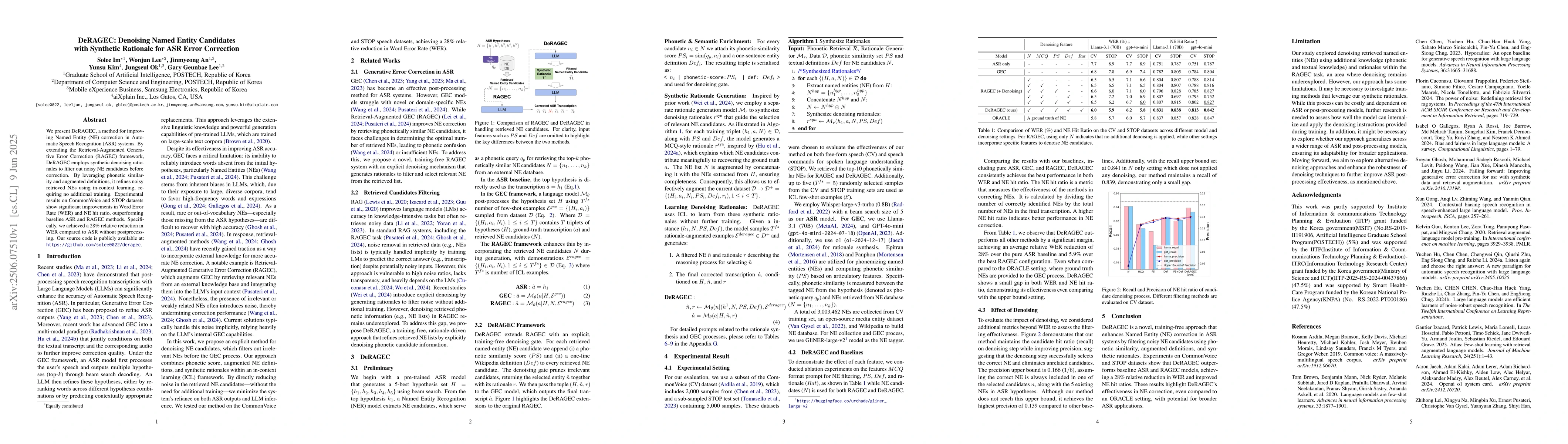 DeRAGEC improves ASR NE correction with a new method that uses synthetic denoising rationales to filter out noisy candidates before correction, achieving significant improvements in WER and NE hit ratio.