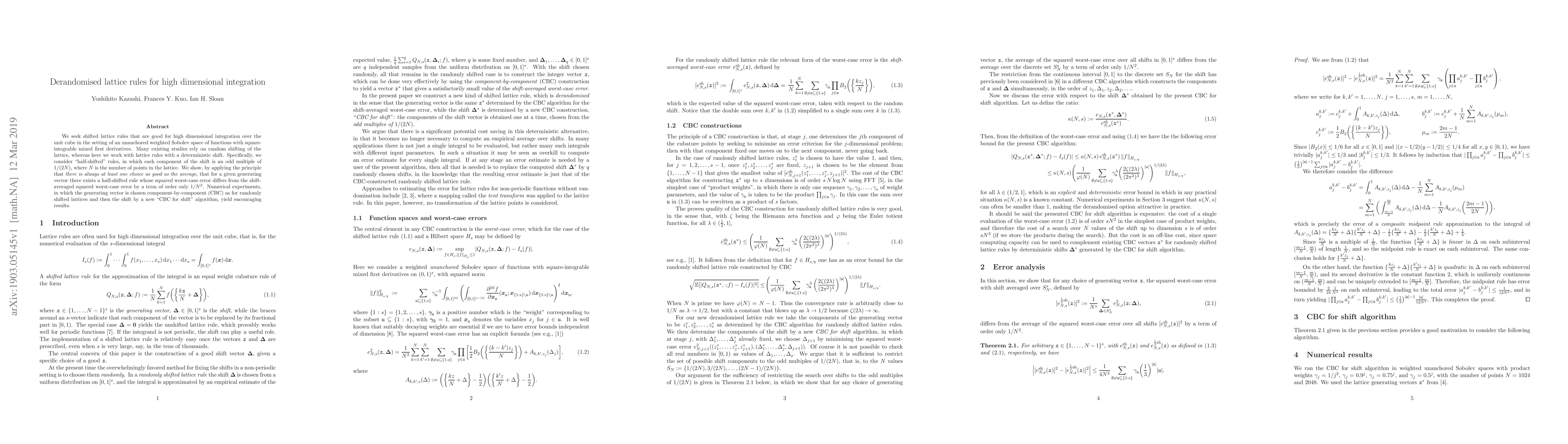 We seek shifted lattice rules that are good for high dimensional integration over the unit cube in the setting of an unanchored weighted Sobolev space of functions with square-integrable mixed first derivatives. Many existing studies rely on random shifting of the lattice, whereas here we work with lattice rules with a deterministic shift. Specifically, we consider "half-shifted" rules, in which each component of the shift is an odd multiple of $1/(2N)$, where $N$ is the number of points in the lattice. We show, by applying the principle that \emph{there is always at least one choice as good as the average}, that for a given generating vector there exists a half-shifted rule whose squared worst-case error differs from the shift-averaged squared worst-case error by a term of order only ${1/N^2}$. Numerical experiments, in which the generating vector is chosen component-by-component (CBC) as for randomly shifted lattices and then the shift by a new "CBC for shift" algorithm, yield encouraging results.
