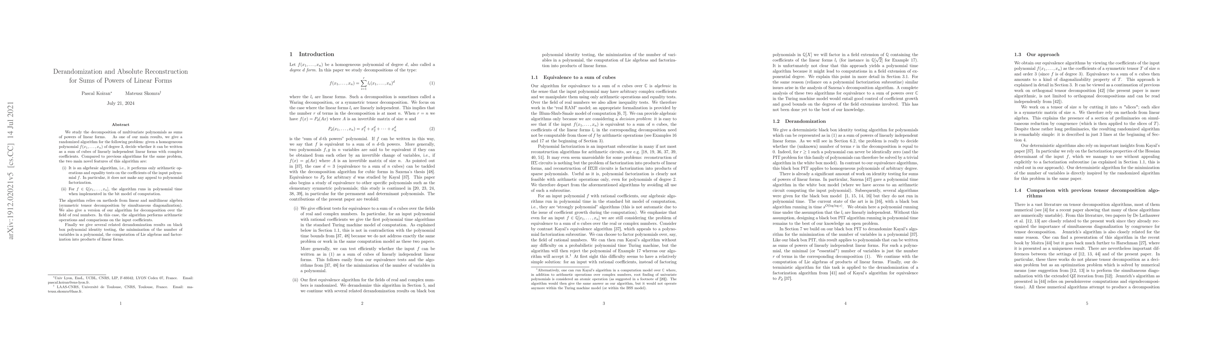 We study the decomposition of multivariate polynomials as sums of powers of linear forms. As one of our main results we give an algorithm for the following problem: given a homogeneous polynomial of degree 3, decide whether it can be written as a sum of cubes of linearly independent linear forms with complex coefficients. Compared to previous algorithms for the same problem, the two main novel features of this algorithm are: (i) It is an algebraic algorithm, i.e., it performs only arithmetic operations and equality tests on the coefficients of the input polynomial. In particular, it does not make any appeal to polynomial factorization. (ii) For an input polynomial with rational coefficients, the algorithm runs in polynomial time when implemented in the bit model of computation. The algorithm relies on methods from linear and multilinear algebra (symmetric tensor decomposition by simultaneous diagonalization). We also give a version of our algorithm for decomposition over the field of real numbers. In this case, the algorithm performs arithmetic operations and comparisons on the input coefficients. Finally we give several related derandomization results on black box polynomial identity testing, the minimization of the number of variables in a polynomial, the computation of Lie algebras and factorization into products of linear forms.