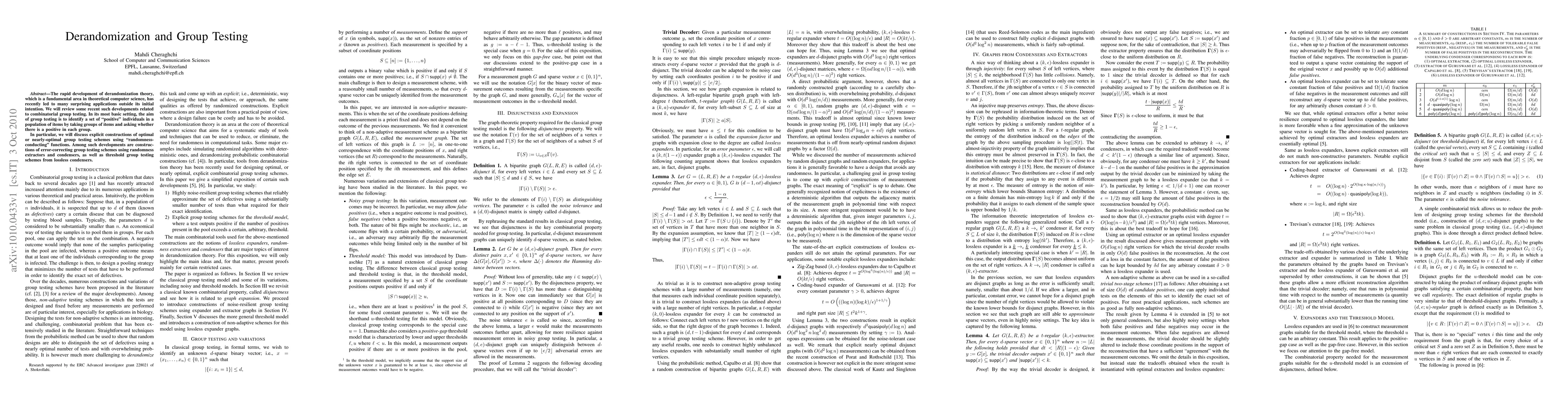 This paper reviews recent applications of derandomization theory in combinatorial group testing, including error-correcting schemes and threshold testing methods. It highlights the development of nearly-optimal group testing schemes using randomness extractors and condensers.