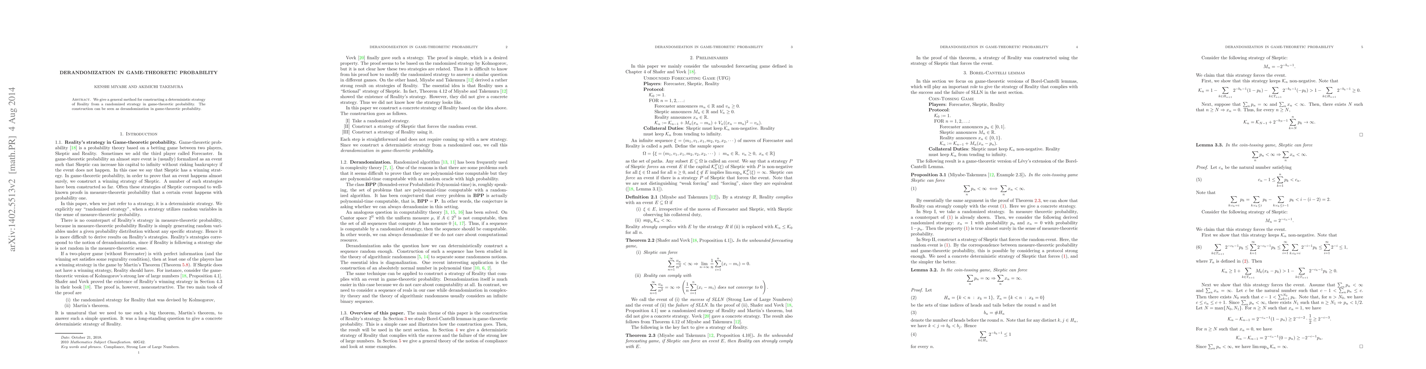 Two-line summary: This paper presents a novel method to convert a randomized strategy into a deterministic one within the context of game-theoretic probability, effectively achieving derandomization in this domain. The approach provides a practical tool for developing deterministic solutions from probabilistic frameworks in game theory.