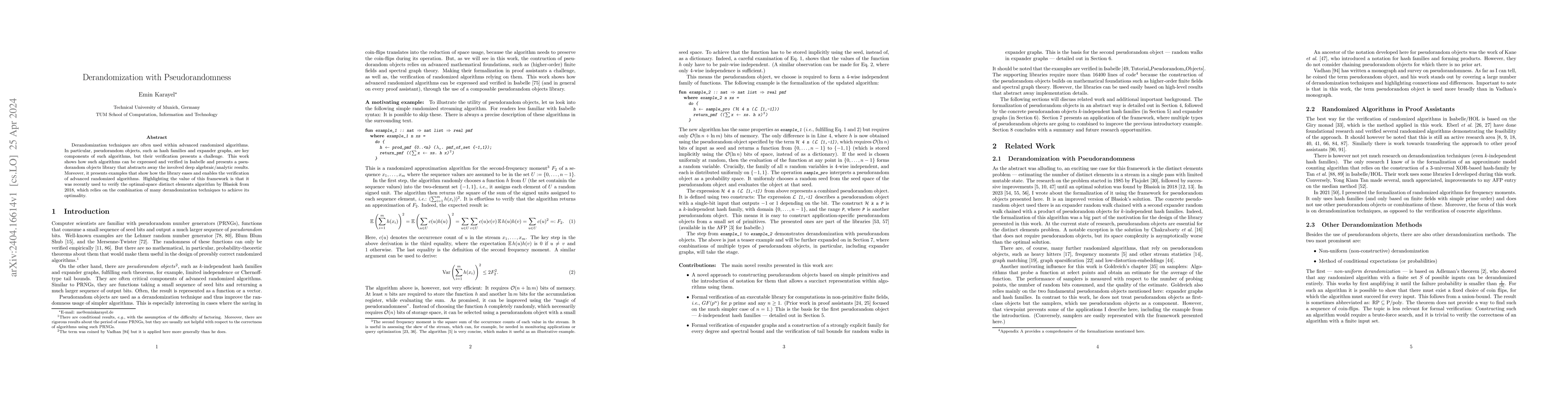 This paper introduces a library in Isabelle for verifying advanced randomized algorithms using pseudorandom objects, simplifying the verification of deep algebraic/analytic results. It highlights its application in verifying Blasiok's optimal-space distinct elements algorithm from 2018, showcasing the framework's effectiveness in combining various derandomization techniques.