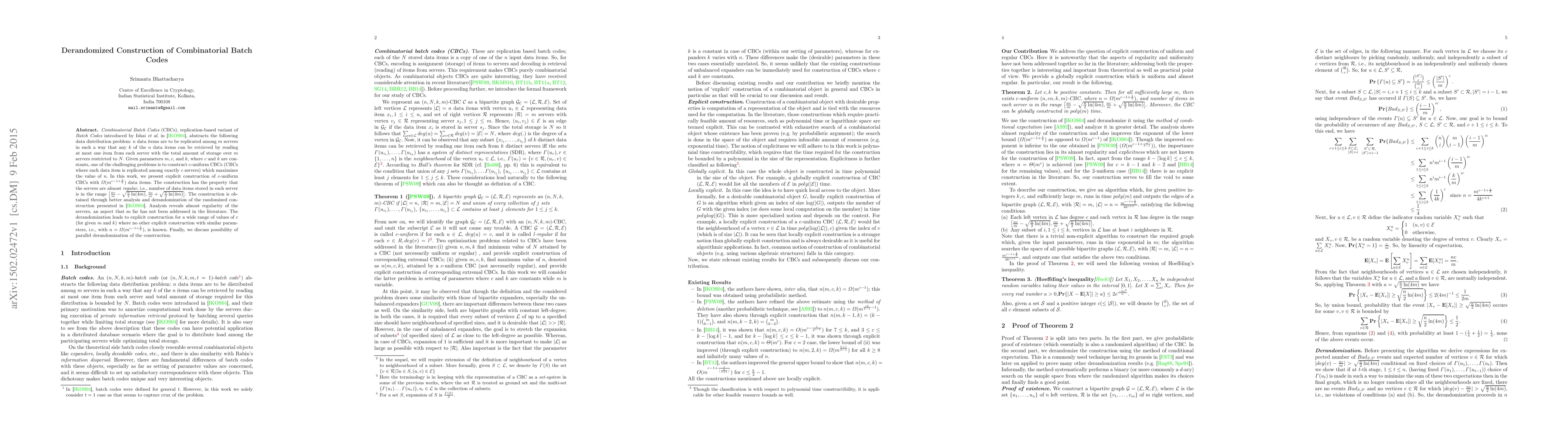 Combinatorial Batch Codes (CBCs), replication-based variant of Batch Codes introduced by Ishai et al. in STOC 2004, abstracts the following data distribution problem: $n$ data items are to be replicated among $m$ servers in such a way that any $k$ of the $n$ data items can be retrieved by reading at most one item from each server with the total amount of storage over $m$ servers restricted to $N$. Given parameters $m, c,$ and $k$, where $c$ and $k$ are constants, one of the challenging problems is to construct $c$-uniform CBCs (CBCs where each data item is replicated among exactly $c$ servers) which maximizes the value of $n$. In this work, we present explicit construction of $c$-uniform CBCs with $\Omega(m^{c-1+{1 \over k}})$ data items. The construction has the property that the servers are almost regular, i.e., number of data items stored in each server is in the range $[{nc \over m}-\sqrt{{n\over 2}\ln (4m)}, {nc \over m}+\sqrt{{n \over 2}\ln (4m)}]$. The construction is obtained through better analysis and derandomization of the randomized construction presented by Ishai et al. Analysis reveals almost regularity of the servers, an aspect that so far has not been addressed in the literature. The derandomization leads to explicit construction for a wide range of values of $c$ (for given $m$ and $k$) where no other explicit construction with similar parameters, i.e., with $n = \Omega(m^{c-1+{1 \over k}})$, is known. Finally, we discuss possibility of parallel derandomization of the construction.