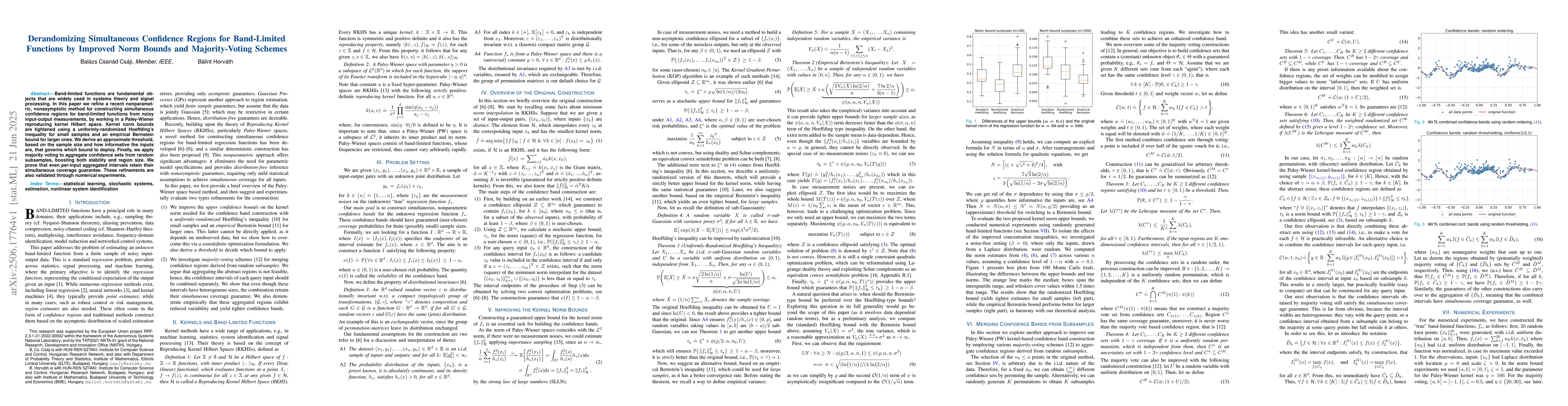 Band-limited functions are fundamental objects that are widely used in systems theory and signal processing. In this paper we refine a recent nonparametric, nonasymptotic method for constructing simultaneous confidence regions for band-limited functions from noisy input-output measurements, by working in a Paley-Wiener reproducing kernel Hilbert space. Kernel norm bounds are tightened using a uniformly-randomized Hoeffding's inequality for small samples and an empirical Bernstein bound for larger ones. We derive an approximate threshold, based on the sample size and how informative the inputs are, that governs which bound to deploy. Finally, we apply majority voting to aggregate confidence sets from random subsamples, boosting both stability and region size. We prove that even per-input aggregated intervals retain their simultaneous coverage guarantee. These refinements are also validated through numerical experiments.