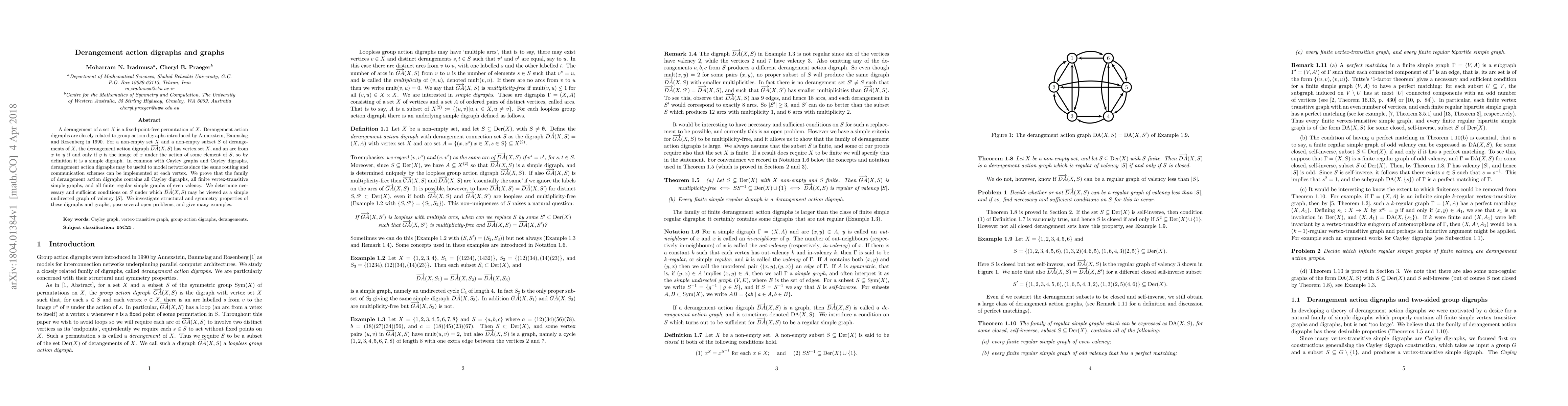 We study the family of \emph{derangement action digraphs}, which are a subfamily of the group action graphs introduced in [Fred Annexstein, Marc Baumslag, and Arnold L. Rosenberg, Group action graphs and parallel architectures, \emph{SIAM J. Comput.} 19 (1990), no. 3, 544--569]. For any non-empty set $X$ and a non-empty subset $S$ of $\Der(X)$, the set of derangments of $X$, we define the derangement action digraph $\rm\overrightarrow{DA}(X;S)$ to have vertex set $X$, and an arc from $x$ to $y$ if and only if $y=x^s$ for some $s\in S$. In common with Cayley graphs and digraphs, derangement action digraphs may be useful to model networks as the same routing and communication scheme can be implemented at each vertex. We determine necessary and sufficient conditions on $S$ under which $\rm\overrightarrow{DA}(X;S)$ may be viewed as a simple graph of valency $|S|$, and we call such graphs derangement action graphs. Also we investigate the structural and symmetry properties of these digraphs and graphs. Several open problems are posed and many examples are given.