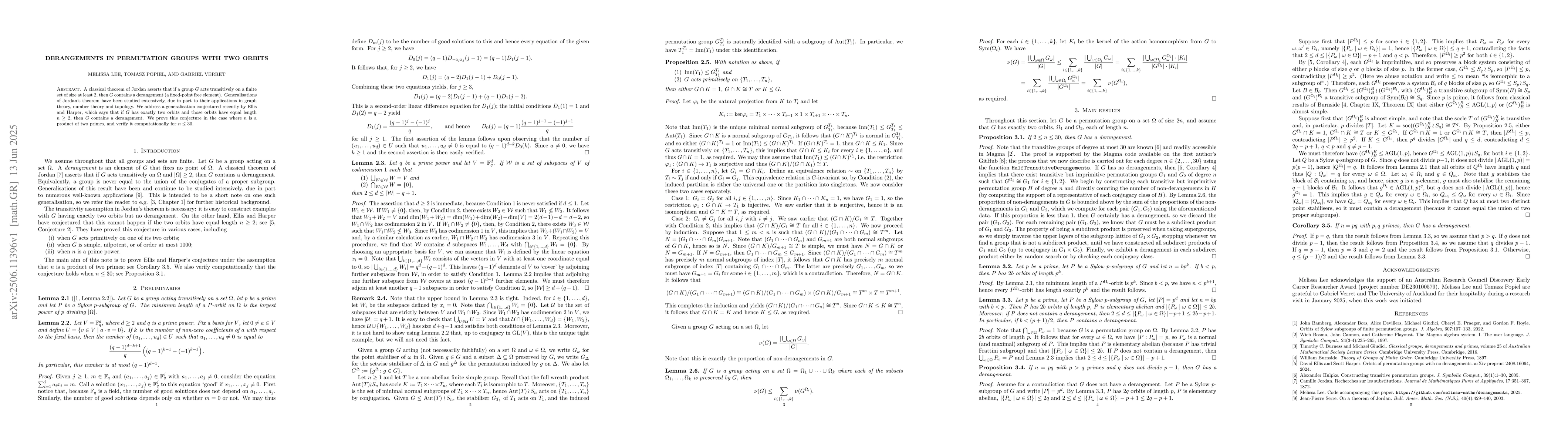A classical theorem of Jordan asserts that if a group $G$ acts transitively on a finite set of size at least $2$, then $G$ contains a derangement (a fixed-point free element). Generalisations of Jordan's theorem have been studied extensively, due in part to their applications in graph theory, number theory and topology. We address a generalisation conjectured recently by Ellis and Harper, which says that if $G$ has exactly two orbits and those orbits have equal length $n \geq 2$, then $G$ contains a derangement. We prove this conjecture in the case where $n$ is a product of two primes, and verify it computationally for $n \leq 30$.