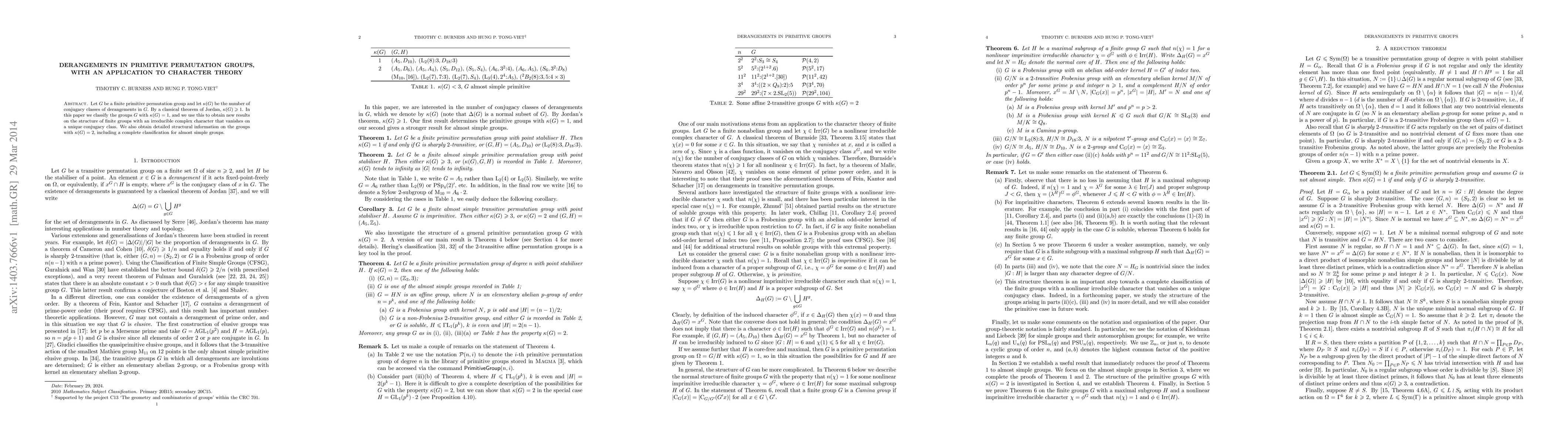 Let $G$ be a finite primitive permutation group and let $\kappa(G)$ be the number of conjugacy classes of derangements in $G$. By a classical theorem of Jordan, $\kappa(G) \geqslant 1$. In this paper we classify the groups $G$ with $\kappa(G)=1$, and we use this to obtain new results on the structure of finite groups with an irreducible complex character that vanishes on a unique conjugacy class. We also obtain detailed structural information on the groups with $\kappa(G)=2$, including a complete classification for almost simple groups.