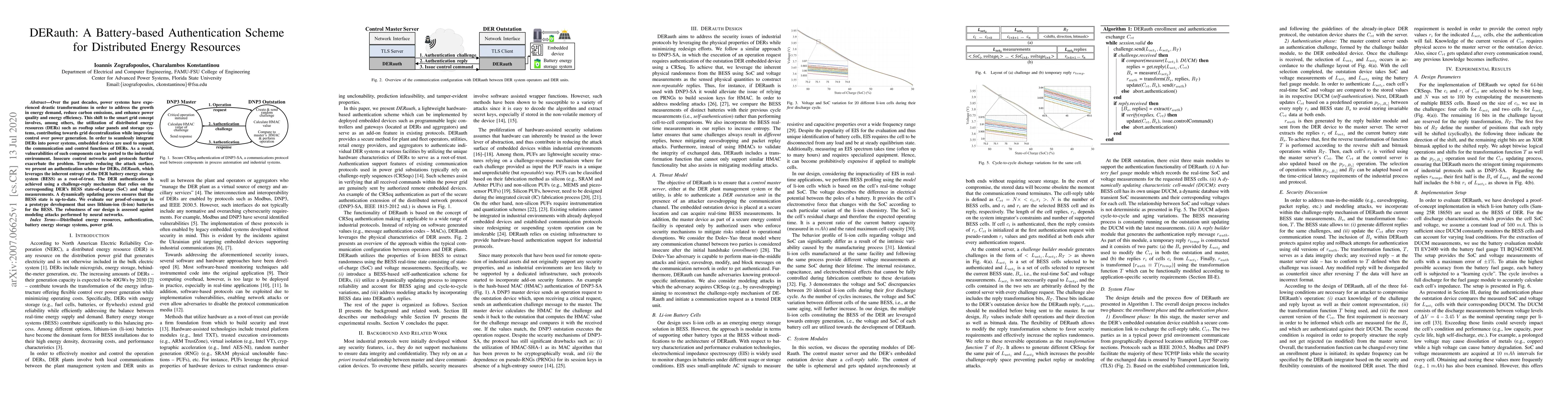 DERauth presents a battery-based authentication scheme for DERs, utilizing BESS state-of-charge and voltage measurements for a challenge-reply mechanism.