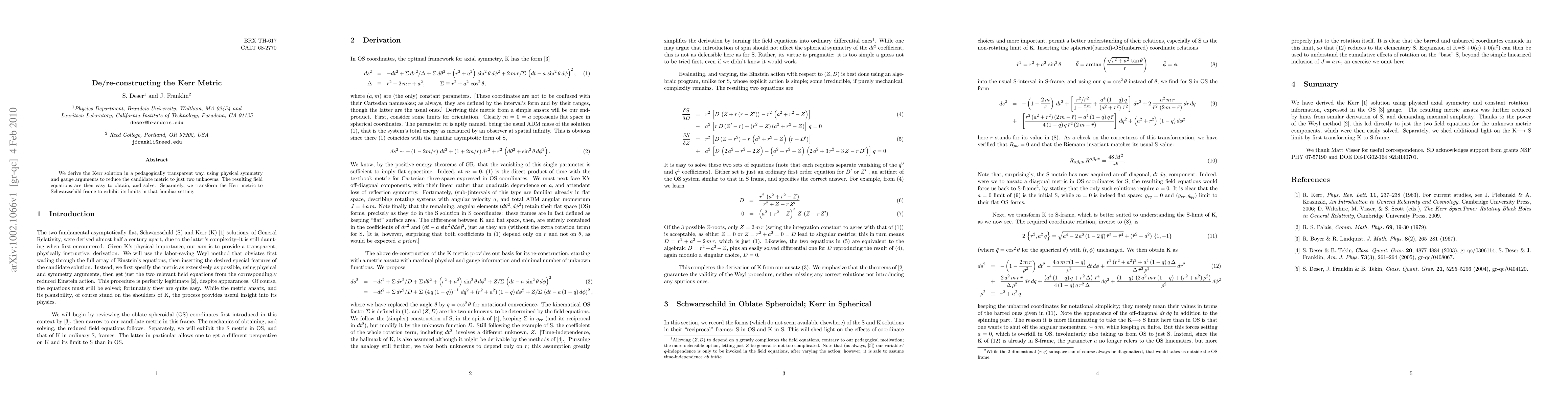 We derive the Kerr solution in a pedagogically transparent way, using physical symmetry and gauge arguments to reduce the candidate metric to just two unknowns. The resulting field equations are then easy to obtain, and solve. Separately, we transform the Kerr metric to Schwarzschild frame to exhibit its limits in that familiar setting.