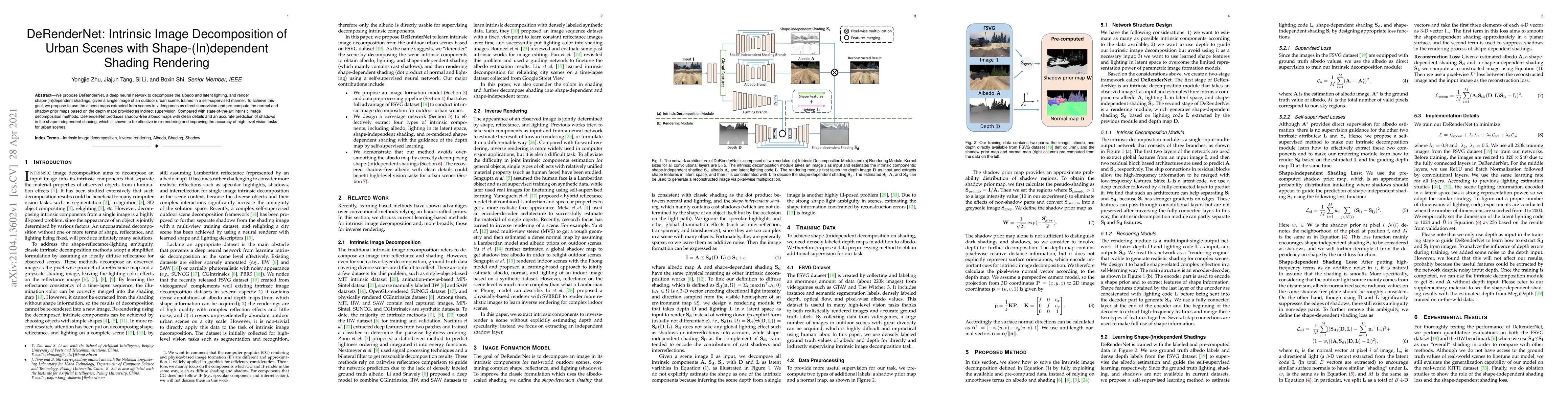 We propose DeRenderNet, a deep neural network to decompose the albedo and latent lighting, and render shape-(in)dependent shadings, given a single image of an outdoor urban scene, trained in a self-supervised manner. To achieve this goal, we propose to use the albedo maps extracted from scenes in videogames as direct supervision and pre-compute the normal and shadow prior maps based on the depth maps provided as indirect supervision. Compared with state-of-the-art intrinsic image decomposition methods, DeRenderNet produces shadow-free albedo maps with clean details and an accurate prediction of shadows in the shape-independent shading, which is shown to be effective in re-rendering and improving the accuracy of high-level vision tasks for urban scenes.