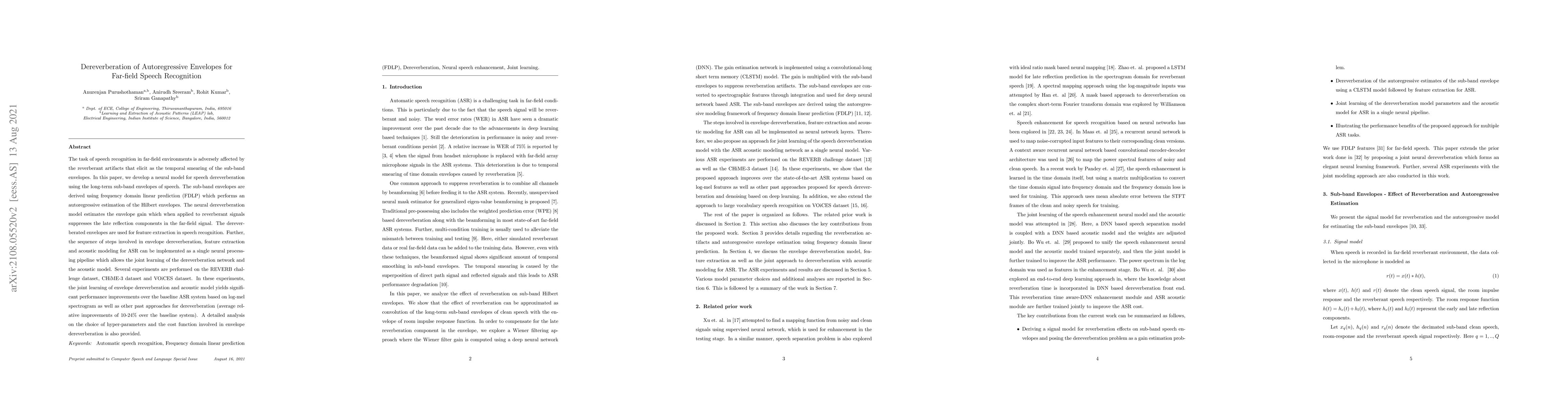 The paper proposes a neural model for speech dereverberation using long-term sub-band envelopes derived via frequency domain linear prediction (FDLP). This model estimates envelope gain to suppress late reflection components in far-field signals, and it's implemented as a single neural processing pipeline for joint learning with acoustic modeling.