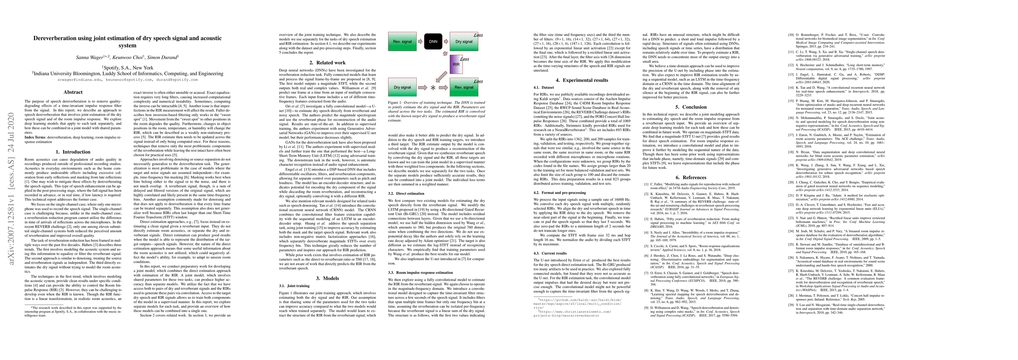 The purpose of speech dereverberation is to remove quality-degrading effects of a time-invariant impulse response filter from the signal. In this report, we describe an approach to speech dereverberation that involves joint estimation of the dry speech signal and of the room impulse response. We explore deep learning models that apply to each task separately, and how these can be combined in a joint model with shared parameters.