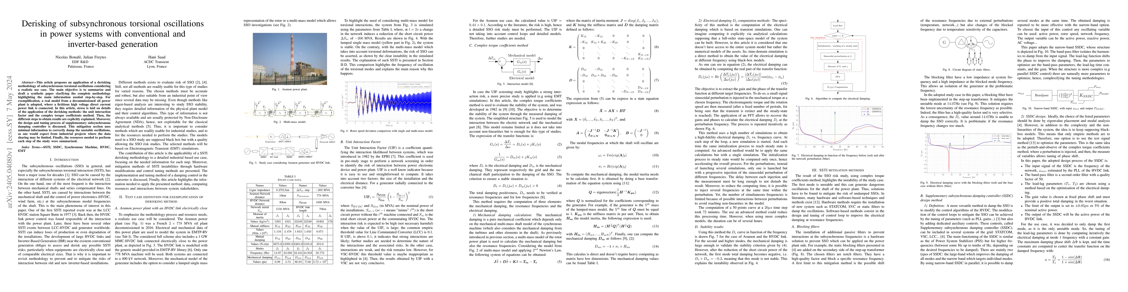 This paper presents a derisking methodology for subsynchronous torsional oscillations in power systems with conventional and inverter-based generation, using a decommissioned oil power plant model. It details the application of the unit interaction factor and complex torque coefficients method, explains the design of a supplementary subsynchronous damping controller, and summarizes the minimal data needed for each step.