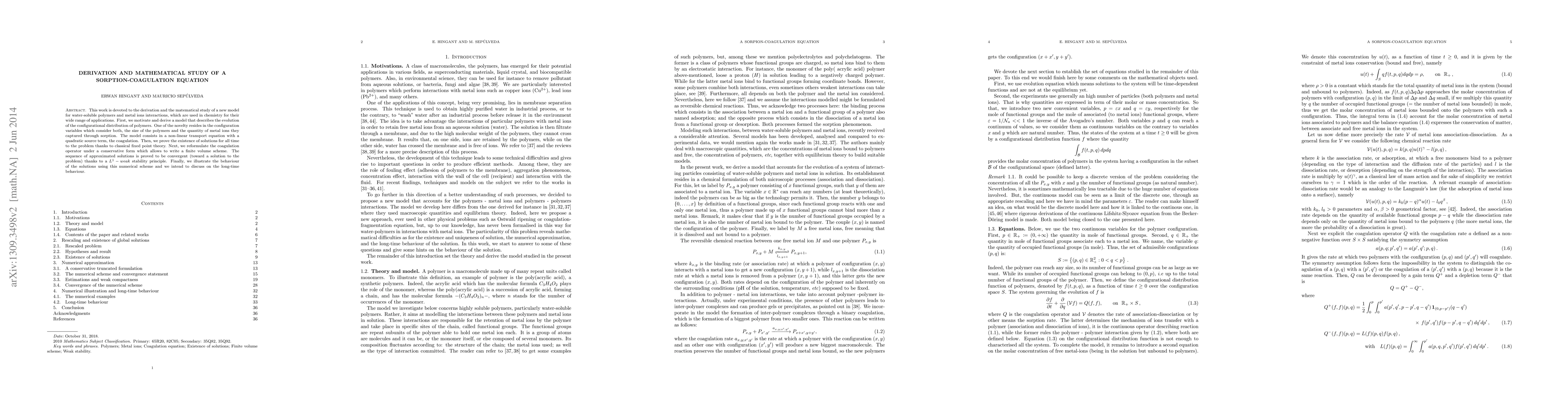 This work is devoted to the derivation and the matematical study of a new model for water-soluble polymers and metal ions interactions, which are used in chemistry for their wide range of applications. First, we motivate and derive a model that describes the evolution of the configurational distribution of polymers. One of the novelty resides in the configuration variables which consider both, the size of the polymers and the quantity of metal ions they captured through sorption. The model consists in a non-linear transport equation with a quadratic source term, the coagulation. Then, we prove the existence of solutions for all time to the problem thanks to classical fixed point theory. Next, we reformulate the coagulation operator under a conservative form which allows to write a finite volume scheme. The sequence of approximated solutions is proved to be convergent (toward a solution to the problem) thanks to a $L^1 - weak$ stability principle. Finally, we illustrate the behaviour of the solutions using this numerical scheme and we intend to discuss on the long-time behaviour.