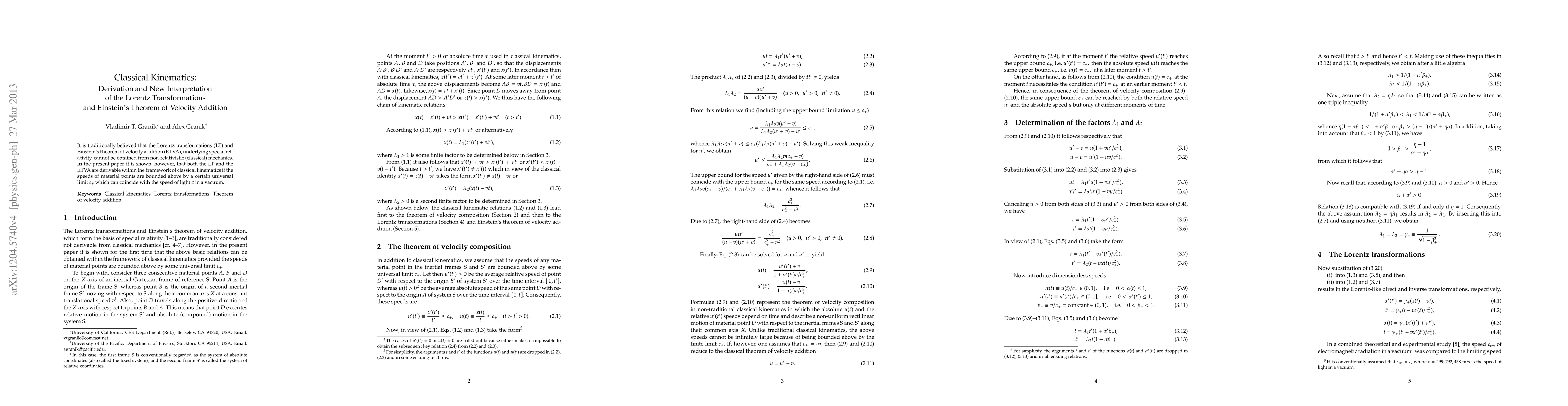 This paper demonstrates that the Lorentz transformations and Einstein's theorem of velocity addition can be derived from classical kinematics under the condition that material point speeds are capped by a universal limit $c_+$, which may equal the speed of light $c$. This challenges the traditional view that these concepts are exclusive to special relativity.