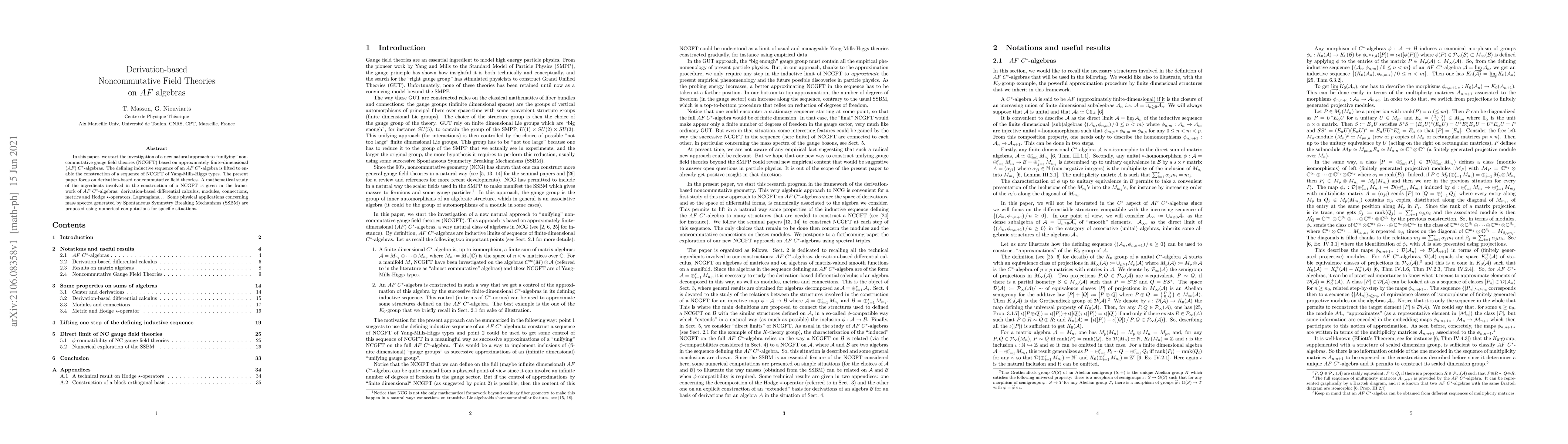 This paper explores a new method for unifying noncommutative gauge field theories using $AF$ $C^*$-algebras, focusing on derivation-based noncommutative field theories and proposing mathematical constructs such as differential calculus, Lagrangians, and SSBM-based mass spectra through numerical computations.