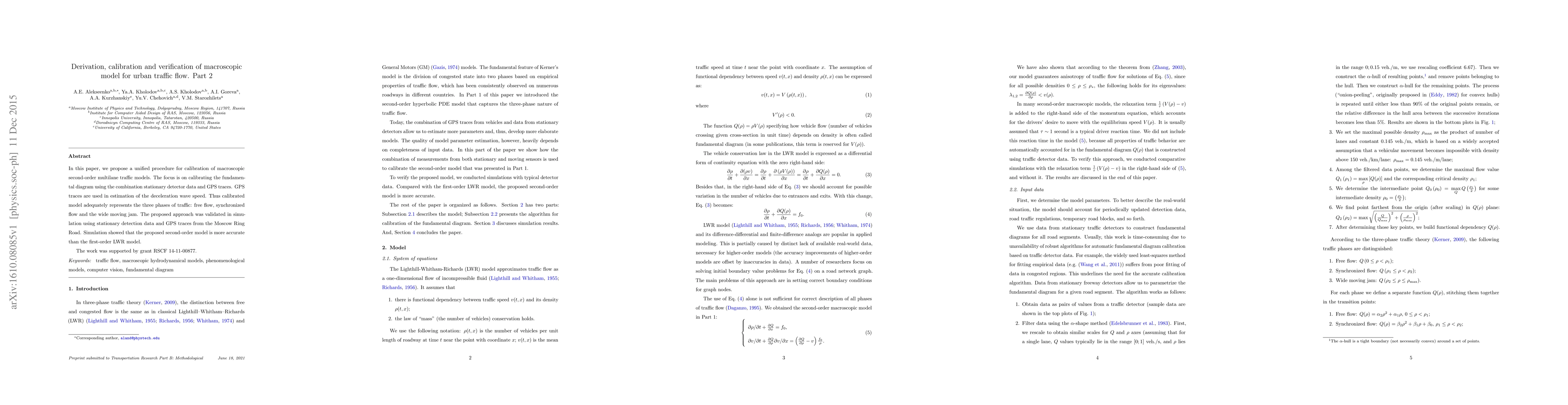 In this paper, we propose a unified procedure for calibration of macroscopic second-order multilane traffic models. The focus is on calibrating the fundamental diagram using the combination stationary detector data and GPS traces. GPS traces are used in estimation of the deceleration wave speed. Thus calibrated model adequately represents the three phases of traffic: free flow, synchronized flow and the wide moving jam. The proposed approach was validated in simulation using stationary detection data and GPS traces from the Moscow Ring Road. Simulation showed that the proposed second-order model is more accurate than the first-order LWR model.