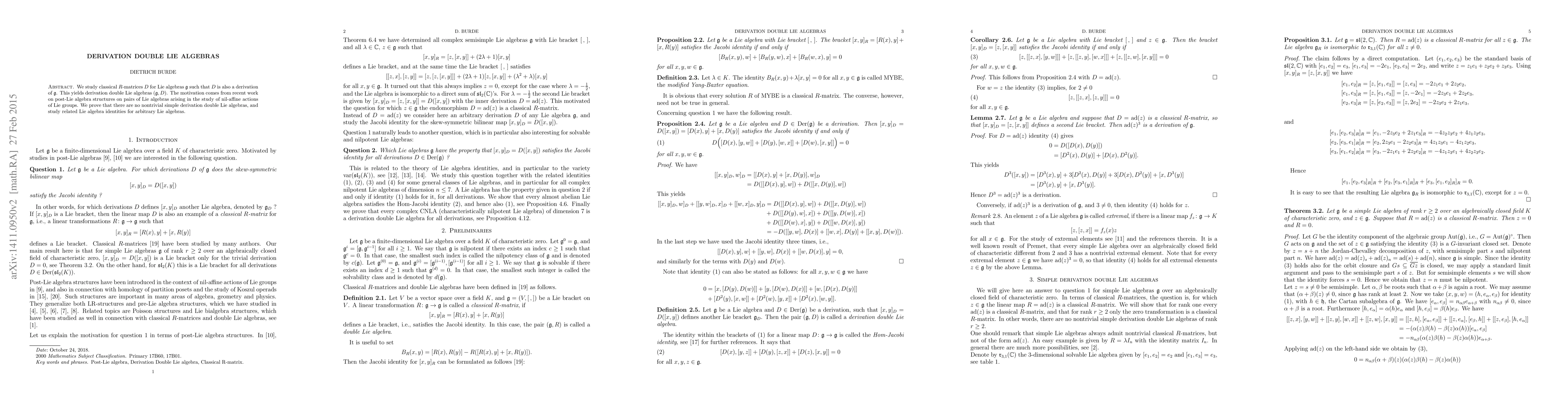 The paper investigates classical R-matrices D that are also derivations for Lie algebras L, leading to derivation double Lie algebras (L,D). The authors prove that there are no nontrivial simple derivation double Lie algebras and explore related Lie algebra identities.