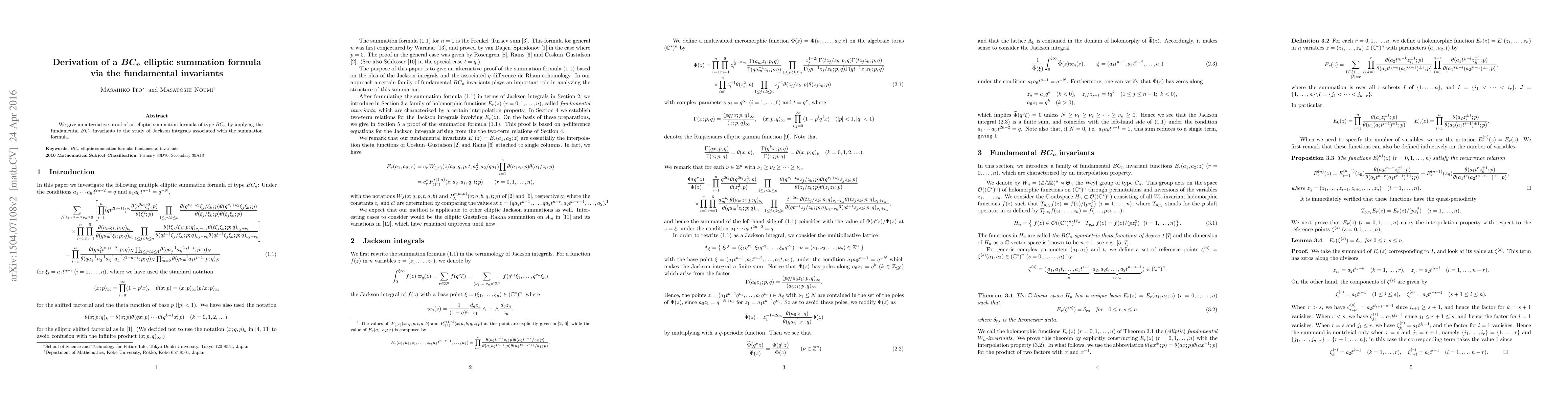 Summary: This paper presents an alternative proof for an elliptic summation formula of type $BC_n$ using the fundamental $BC_n$ invariants, focusing on the analysis of Jackson integrals linked to the summation formula.