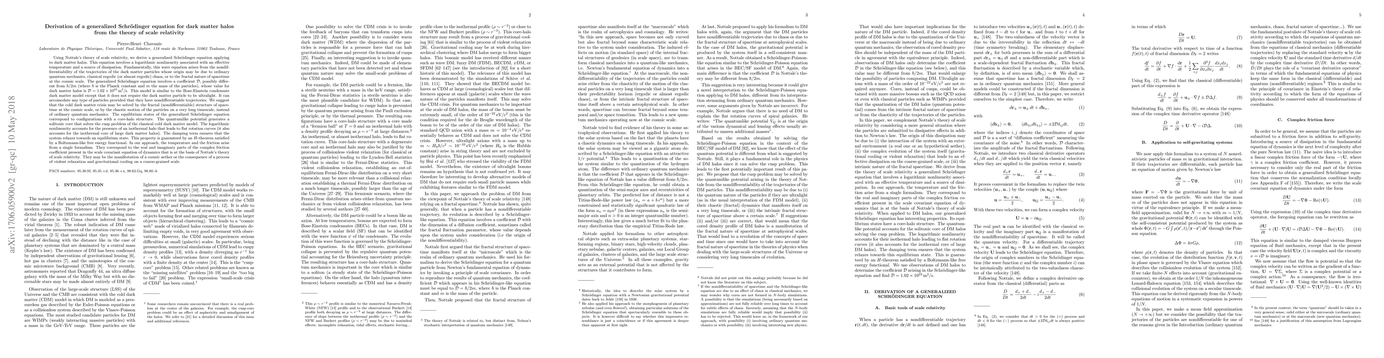 This paper derives a generalized Schrödinger equation for dark matter halos from Nottale's theory of scale relativity, introducing a logarithmic nonlinearity and a dissipative term. The equation resolves the cold dark matter crisis by suggesting that the fractal structure of spacetime or chaotic particle motion, rather than ordinary quantum mechanics, explains dark matter behavior.