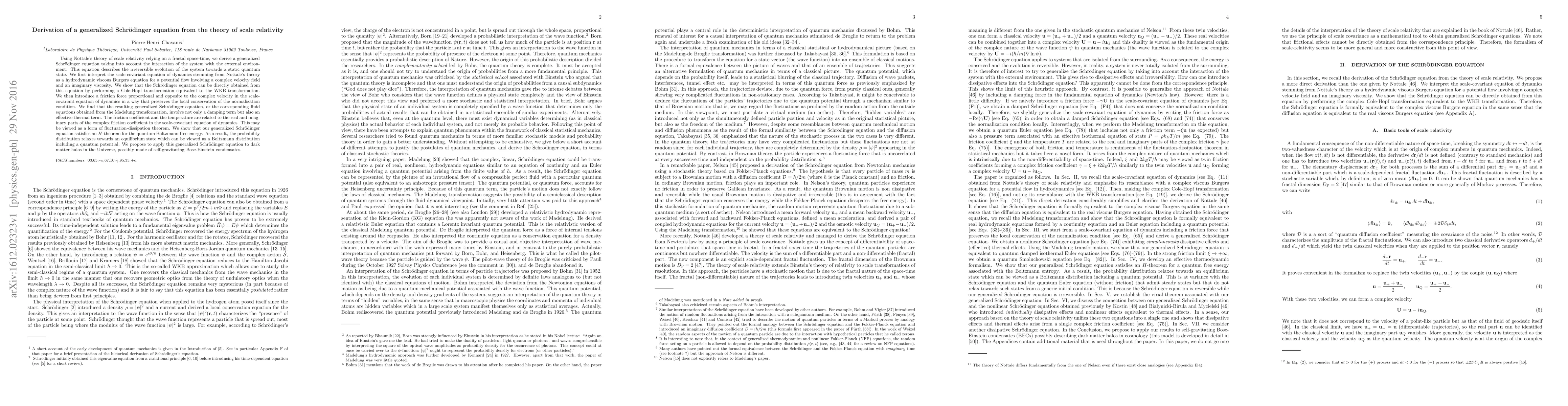 Using Nottale's theory of scale relativity relying on a fractal space-time, we derive a generalized Schr\"odinger equation taking into account the interaction of the system with the external environment. This equation describes the irreversible evolution of the system towards a static quantum state. We first interpret the scale-covariant equation of dynamics stemming from Nottale's theory as a hydrodynamic viscous Burgers equation for a potential flow involving a complex velocity field and an imaginary viscosity. We show that the Schr\"odinger equation can be directly obtained from this equation by performing a Cole-Hopf transformation equivalent to the WKB transformation. We then introduce a friction force proportional and opposite to the complex velocity in the scale-covariant equation of dynamics in a way that preserves the local conservation of the normalization condition. We find that the resulting generalized Schr\"odinger equation, or the corresponding fluid equations obtained from the Madelung transformation, involve not only a damping term but also an effective thermal term. The friction coefficient and the temperature are related to the real and imaginary parts of the complex friction coefficient in the scale-covariant equation of dynamics. This may be viewed as a form of fluctuation-dissipation theorem. We show that our generalized Schr\"odinger equation satisfies an $H$-theorem for the quantum Boltzmann free energy. As a result, the probability distribution relaxes towards an equilibrium state which can be viewed as a Boltzmann distribution including a quantum potential. We propose to apply this generalized Schr\"odinger equation to dark matter halos in the Universe, possibly made of self-gravitating Bose-Einstein condensates.