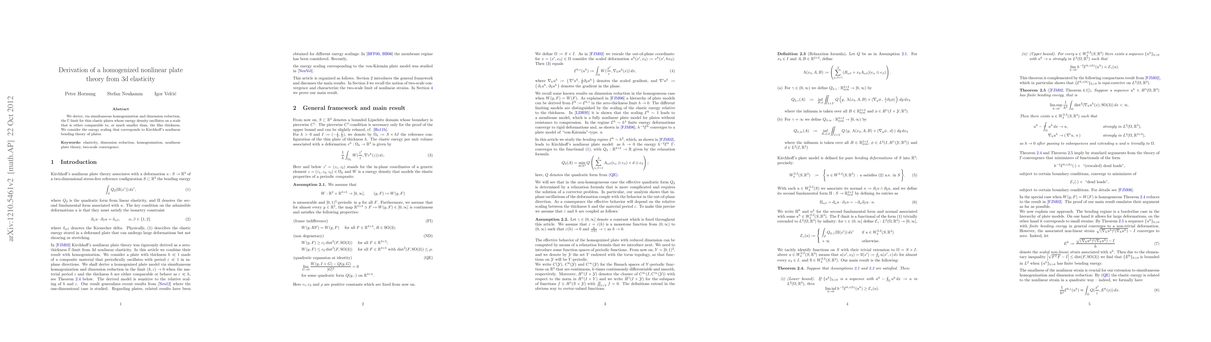 This paper derives a homogenized nonlinear plate theory from 3D elasticity through simultaneous homogenization and dimension reduction, focusing on thin elastic plates with energy density oscillations on scales comparable to or smaller than the plate thickness, aligning with Kirchhoff's nonlinear bending theory.