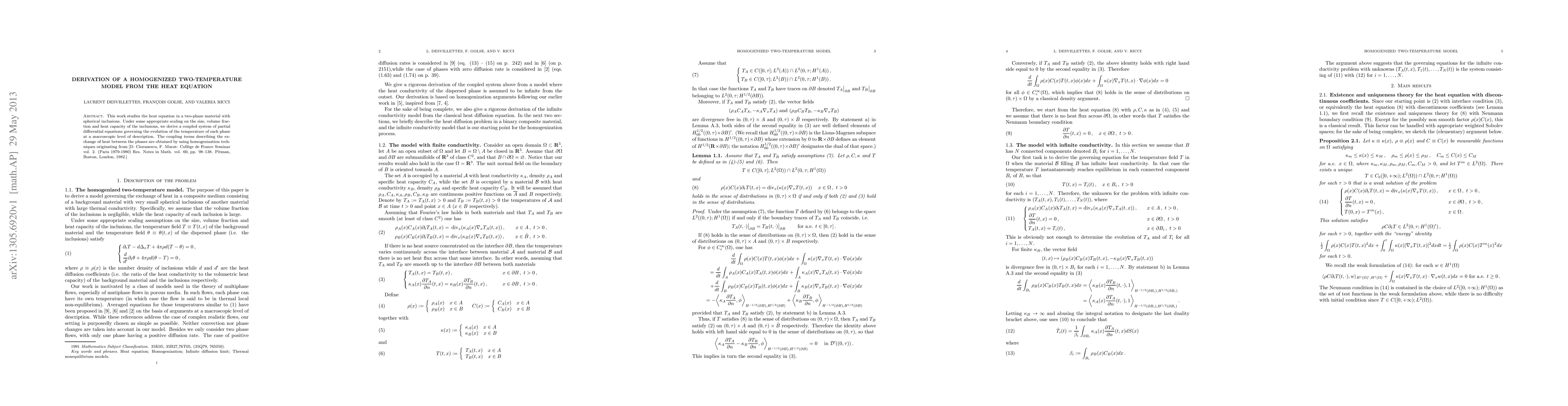 This paper derives a homogenized two-temperature model from the heat equation for a two-phase material with spherical inclusions, employing homogenization techniques to obtain macroscopic coupled partial differential equations for each phase's temperature evolution. The coupling terms are derived based on scaling laws for inclusion size, volume fraction, and heat capacity.