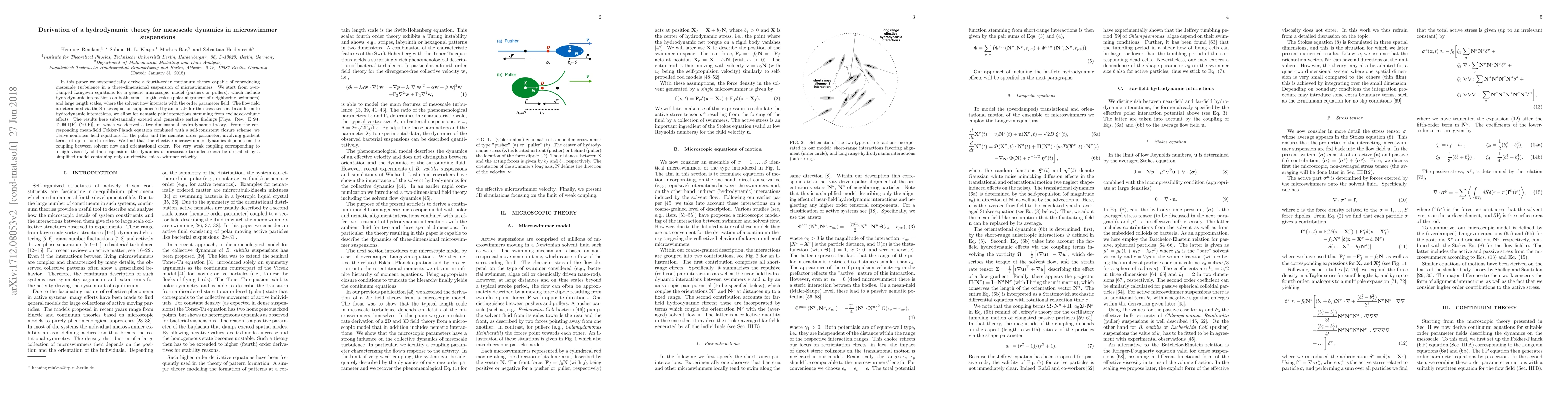 This paper derives a fourth-order continuum theory for mesoscale turbulence in microswimmer suspensions, extending previous two-dimensional models. The theory incorporates hydrodynamic interactions and nematic pair interactions, leading to nonlinear field equations for order parameters.