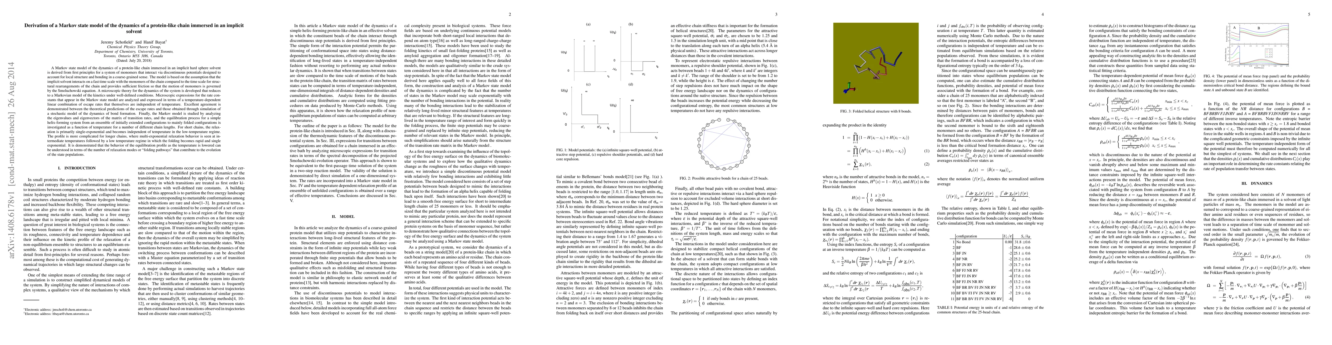 A Markov state model of the dynamics of a protein-like chain immersed in an implicit hard sphere solvent is derived from first principles for a system of monomers that interact via discontinuous potentials designed to account for local structure and bonding in a coarse-grained sense. The model is based on the assumption that the implicit solvent interacts on a fast time scale with the monomers of the chain compared to the time scale for structural rearrangements of the chain and provides sufficient friction so that the motion of monomers is governed by the Smoluchowski equation. A microscopic theory for the dynamics of the system is developed that reduces to a Markovian model of the kinetics under well-defined conditions. Microscopic expressions for the rate constants that appear in the Markov state model are analyzed and expressed in terms of a temperature-dependent linear combination of escape rates that themselves are independent of temperature. The Markov model is studied by analyzing the eigenvalues and eigenvectors of the matrix of transition rates, and the equilibration process for a simple helix-forming system from an ensemble of initially extended configurations to mainly folded configurations is investigated as a function of temperature for a number of different chain lengths. For short chains, the relaxation is primarily single-exponential and becomes independent of temperature in the low-temperature regime. The profile is more complicated for longer chains, where multi-exponential relaxation behavior is seen at intermediate temperatures followed by a low temperature regime in which the folding becomes rapid and single exponential. It is demonstrated that the behavior of the equilibration profile as the temperature is lowered can be understood in terms of the number of relaxation modes or ``folding pathways'' that contribute to the evolution of the state populations.