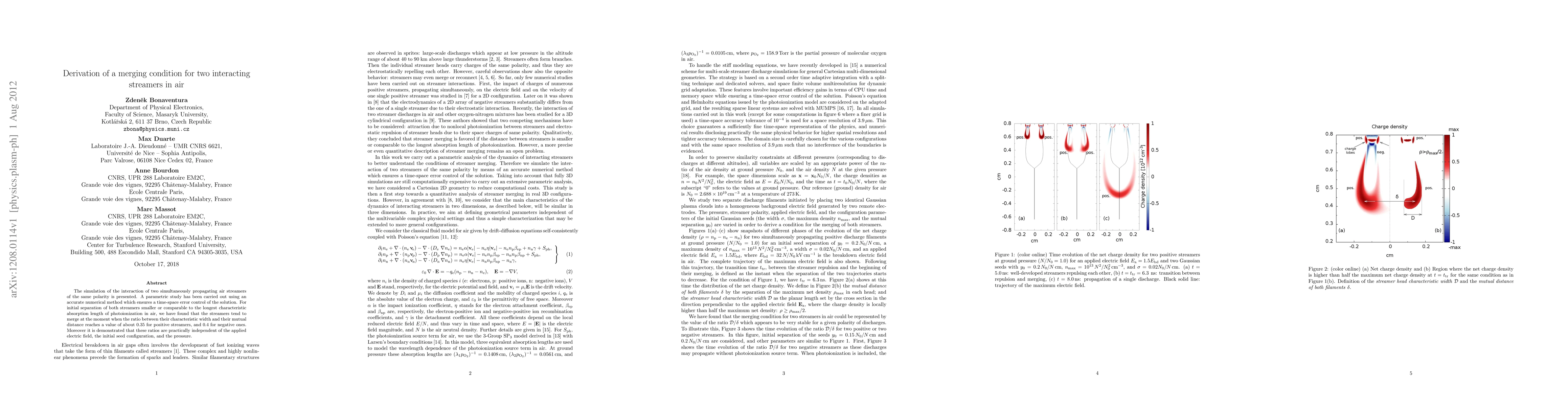 This paper derives a merging condition for two interacting air streamers, finding that they merge when the ratio of their characteristic width to their mutual distance reaches approximately 0.35 for positive streamers and 0.4 for negative ones, independent of electric field, initial seed configuration, and pressure.
