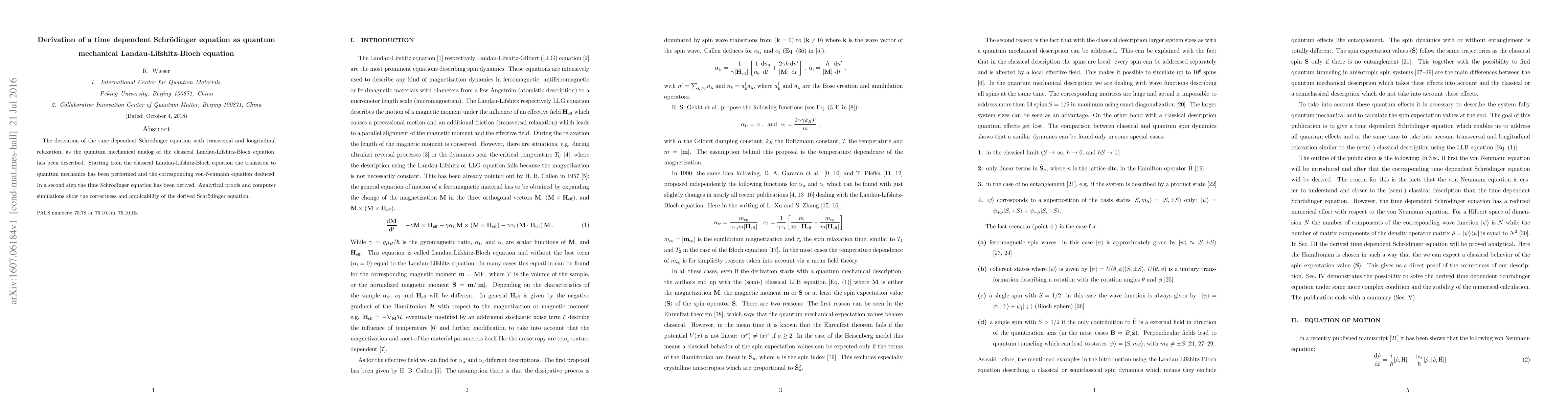 The derivation of the time dependent Schr\"odinger equation with transversal and longitudinal relaxation, as the quantum mechanical analog of the classical Landau-Lifshitz-Bloch equation, has been described. Starting from the classical Landau-Lifshitz-Bloch equation the transition to quantum mechanics has been performed and the corresponding von-Neumann equation deduced. In a second step the time Schr\"odinger equation has been derived. Analytical proofs and computer simulations show the correctness and applicability of the derived Schr\"odinger equation.