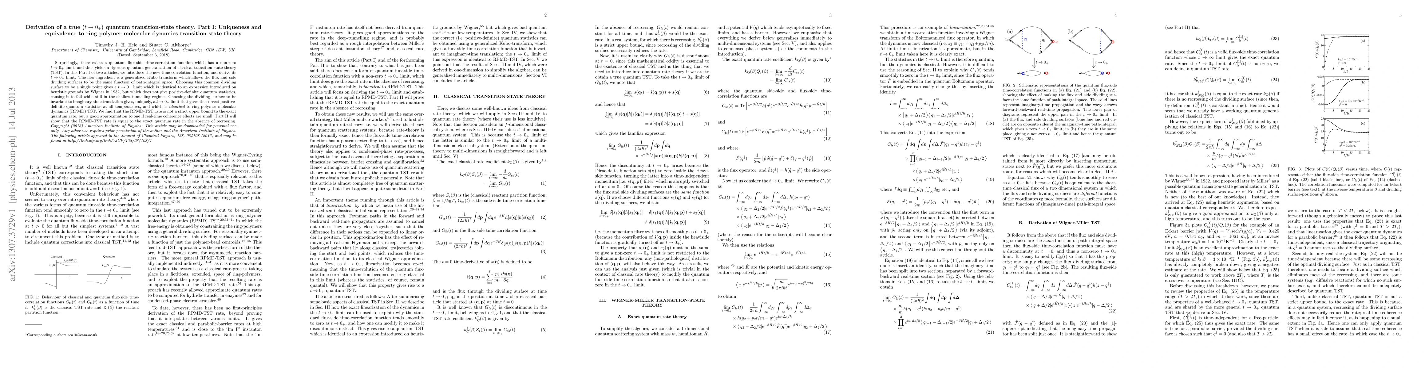 Surprisingly, there exists a quantum flux-side time-correlation function which has a non-zero short-time (t->0+) limit, and thus yields a rigorous quantum generalization of classical transition-state theory (TST). In this Part I of two articles, we introduce the new time-correlation function, and derive its short-time limit. The new ingredient is a generalized Kubo transform which allows the flux and side dividing surfaces to be the same function of path-integral space. Choosing this common dividing surface to be a single point gives a short-time limit which is identical to an expression introduced on heuristic grounds by Wigner in 1932, but which does not give positive-definite quantum statistics, causing it to fail while still in the shallow-tunnelling regime. Choosing the dividing surface to be invariant to imaginary-time translation gives, uniquely, a short-time limit that gives the correct positive- definite quantum statistics at all temperatures, and which is identical to ring-polymer molecular dynamics (RPMD) TST. We find that the RPMD-TST rate is not a strict upper bound to the exact quantum rate, but a good approximation to one if real-time coherence effects are small. Part II will show that the RPMD-TST rate is equal to the exact quantum rate in the absence of recrossing.