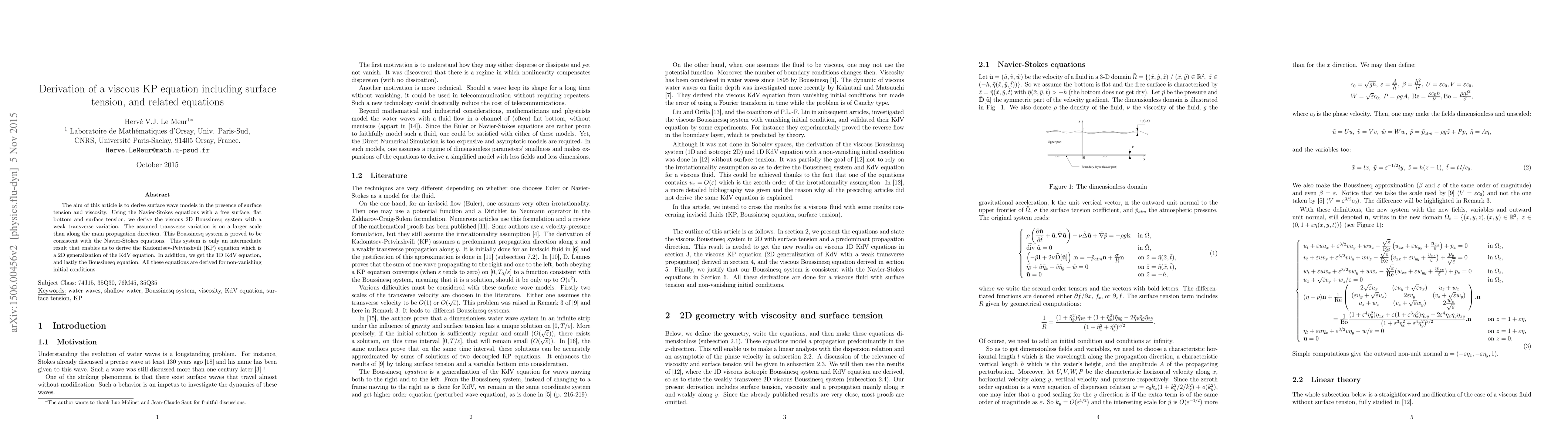 The aim of this article is to derive surface wave models in the presence of surface tension and viscosity. Using the Navier-Stokes equations with a free surface, flat bottom and surface tension, we derive the viscous 2D Boussinesq system with a weak transverse variation. The assumed transverse variation is on a larger scale than along the main propagation direction. This Boussinesq system is proved to be consistent with the Navier-Stokes equations. This system is only an intermediate result that enables us to derive the Kadomtsev-Petviashvili (KP) equation which is a 2D generalization of the KdV equation. In addition, we get the 1D KdV equation, and lastly the Boussinesq equation. All these equations are derived for non-vanishing initial conditions.