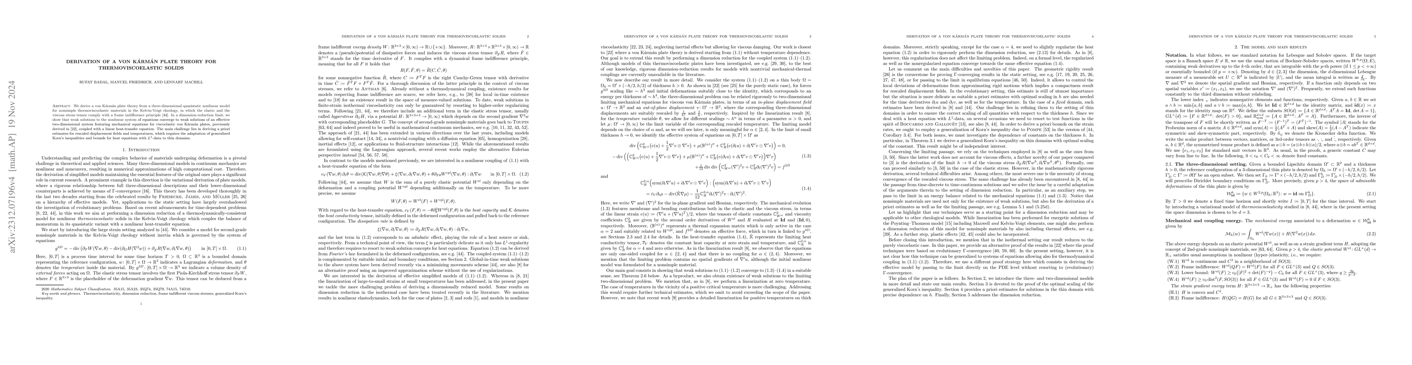 This paper derives a von Kármán plate theory for thermoviscoelastic solids from a three-dimensional nonlinear model, showing convergence to a two-dimensional system featuring viscoelastic plate equations coupled with a heat transfer equation. The main challenge involves deriving a priori estimates for displacement fields and temperatures, requiring adaptations of generalized Korn's inequalities and heat equation bounds for thin domains.