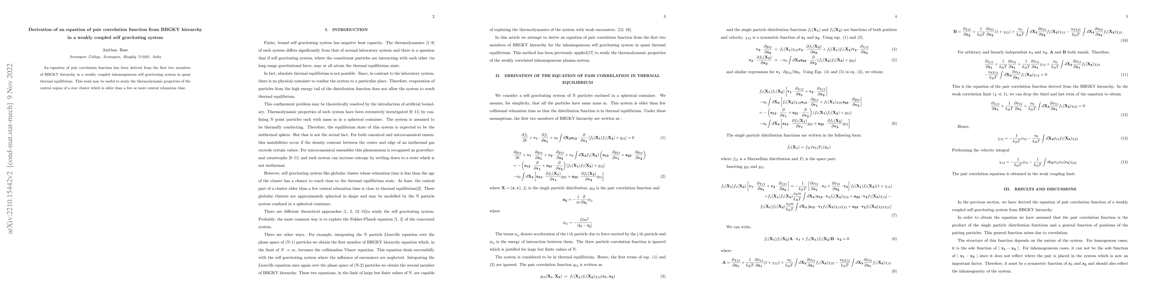 This paper derives an equation for the pair correlation function from the BBGKY hierarchy in a weakly coupled, self-gravitating system, focusing on quasi-thermal equilibrium. The findings are relevant for studying thermodynamic properties in the central regions of old star clusters.