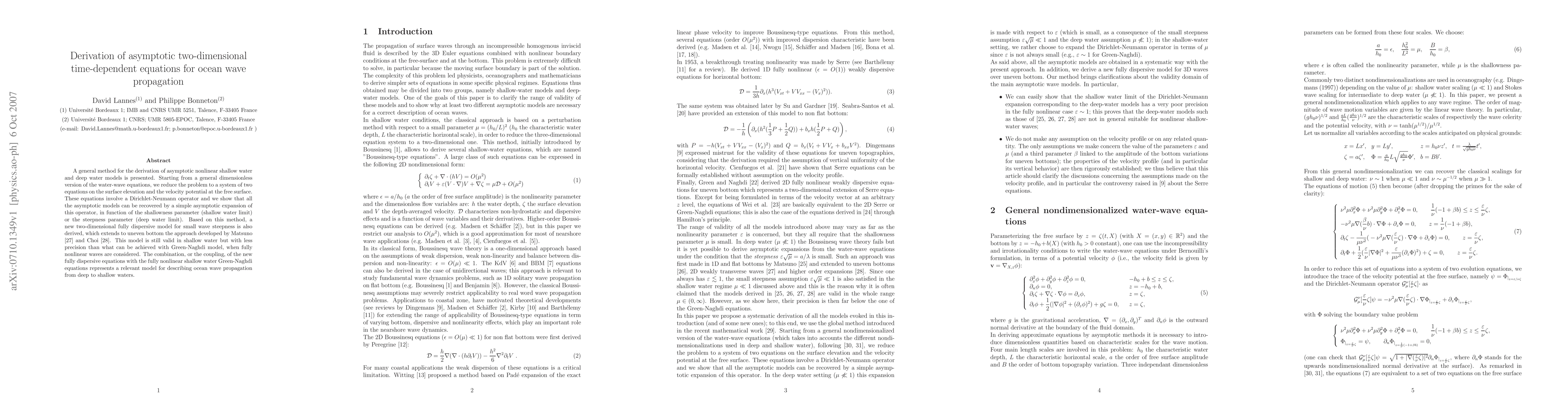 A general method for the derivation of asymptotic nonlinear shallow water and deep water models is presented. Starting from a general dimensionless version of the water-wave equations, we reduce the problem to a system of two equations on the surface elevation and the velocity potential at the free surface. These equations involve a Dirichlet-Neumann operator and we show that all the asymptotic models can be recovered by a simple asymptotic expansion of this operator, in function of the shallowness parameter (shallow water limit) or the steepness parameter (deep water limit). Based on this method, a new two-dimensional fully dispersive model for small wave steepness is also derived, which extends to uneven bottom the approach developed by Matsuno \cite{matsuno3} and Choi \cite{choi}. This model is still valid in shallow water but with less precision than what can be achieved with Green-Naghdi model, when fully nonlinear waves are considered. The combination, or the coupling, of the new fully dispersive equations with the fully nonlinear shallow water Green-Naghdi equations represents a relevant model for describing ocean wave propagation from deep to shallow waters.