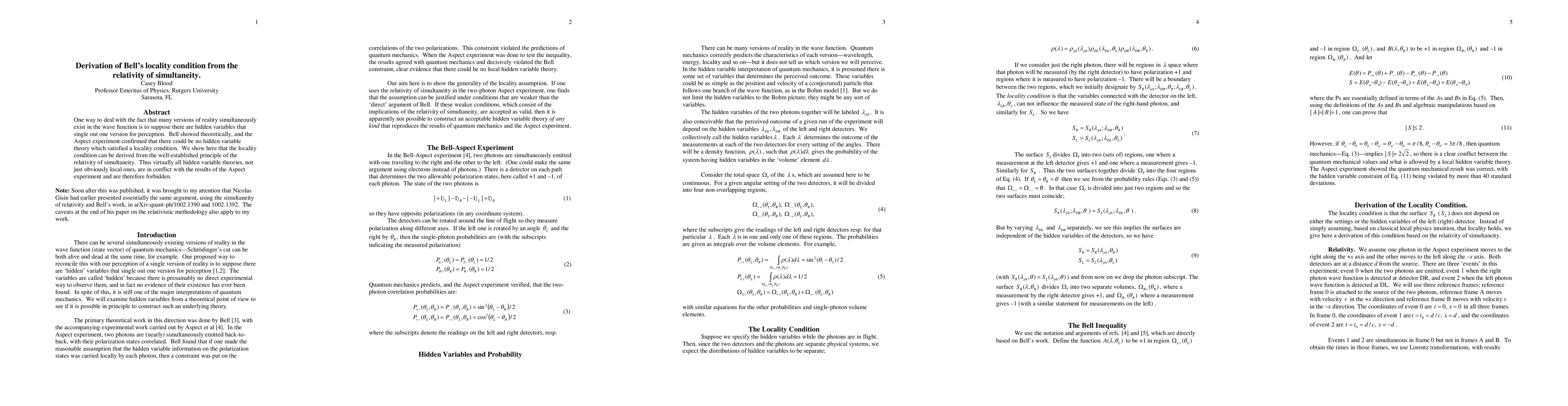 One way to deal with the fact that many versions of reality simultanenously exist in the wave function is to suppose there are hidden variables that single out one version for perception. Bell showed theoretically and the Aspect experiment confirmed that there could be no hidden variable theory which satisfied a locality condition. We show here that the locality condition can be derived from the well-established principle of the relativity of simultaneity. Thus virtually all hidden variable theories, not just obviously local ones, are in conflict with the results of the Aspect experiment and are therefore forbidden.