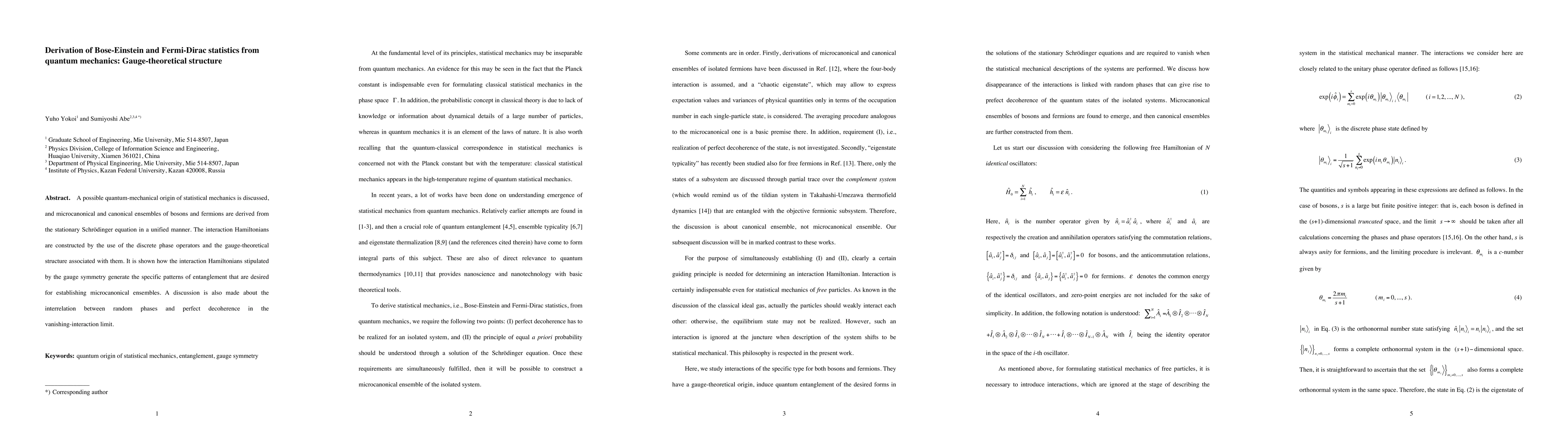 A possible quantum-mechanical origin of statistical mechanics is discussed, and microcanonical and canonical ensembles of bosons and fermions are derived from the stationary Schr\"odinger equation in a unified manner. The interaction Hamiltonians are constructed by the use of the discrete phase operators and the gauge-theoretical structure associated with them. It is shown how the interaction Hamiltonians stipulated by the gauge symmetry generate the specific patterns of entanglement that are desired for establishing microcanonical ensembles. A discussion is also made about the interrelation between random phases and perfect decoherence in the vanishing-interaction limit.
