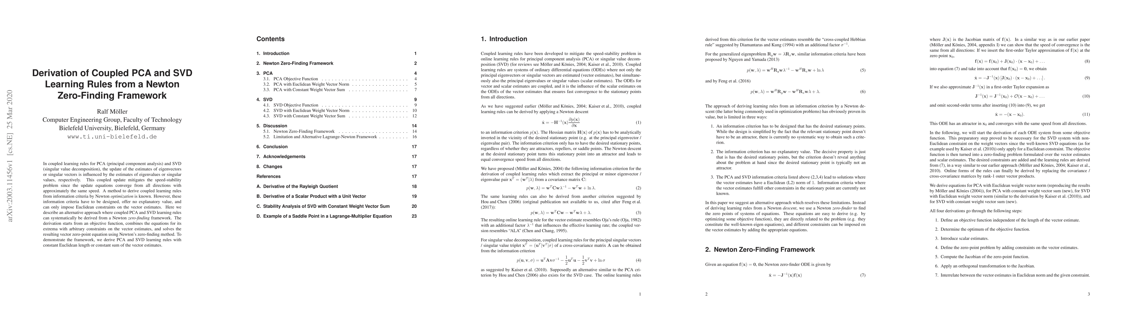 In coupled learning rules for PCA (principal component analysis) and SVD (singular value decomposition), the update of the estimates of eigenvectors or singular vectors is influenced by the estimates of eigenvalues or singular values, respectively. This coupled update mitigates the speed-stability problem since the update equations converge from all directions with approximately the same speed. A method to derive coupled learning rules from information criteria by Newton optimization is known. However, these information criteria have to be designed, offer no explanatory value, and can only impose Euclidean constraints on the vector estimates. Here we describe an alternative approach where coupled PCA and SVD learning rules can systematically be derived from a Newton zero-finding framework. The derivation starts from an objective function, combines the equations for its extrema with arbitrary constraints on the vector estimates, and solves the resulting vector zero-point equation using Newton's zero-finding method. To demonstrate the framework, we derive PCA and SVD learning rules with constant Euclidean length or constant sum of the vector estimates.