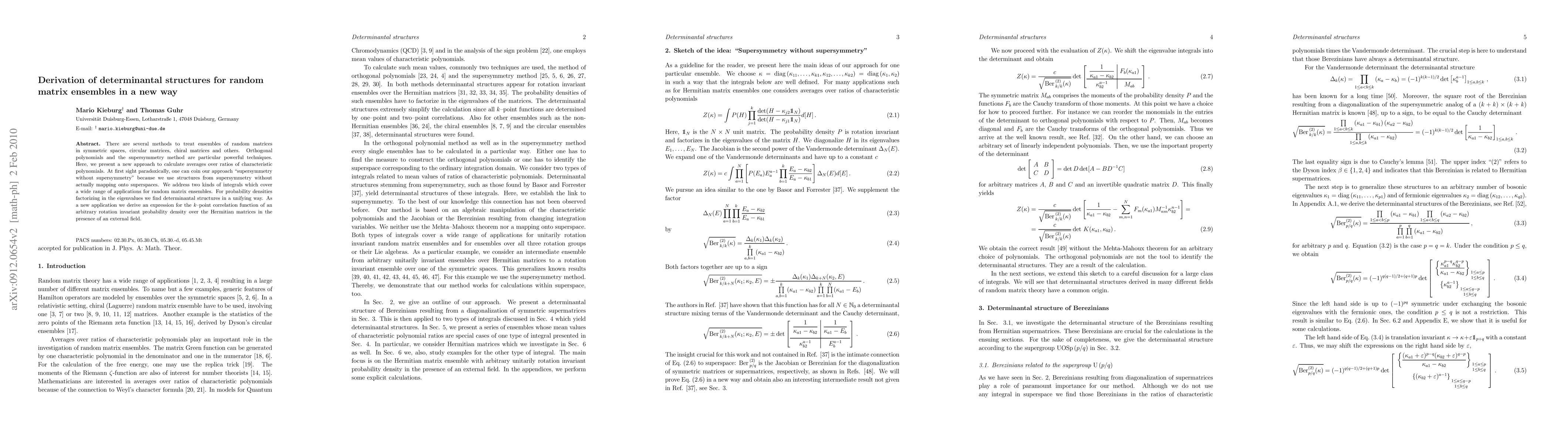 This paper introduces a novel method to derive determinantal structures for random matrix ensembles, bypassing traditional supersymmetry techniques. It presents a "supersymmetry without supersymmetry" approach, focusing on calculating averages over ratios of characteristic polynomials, and derives determinantal structures for probability densities factorizing in eigenvalues.